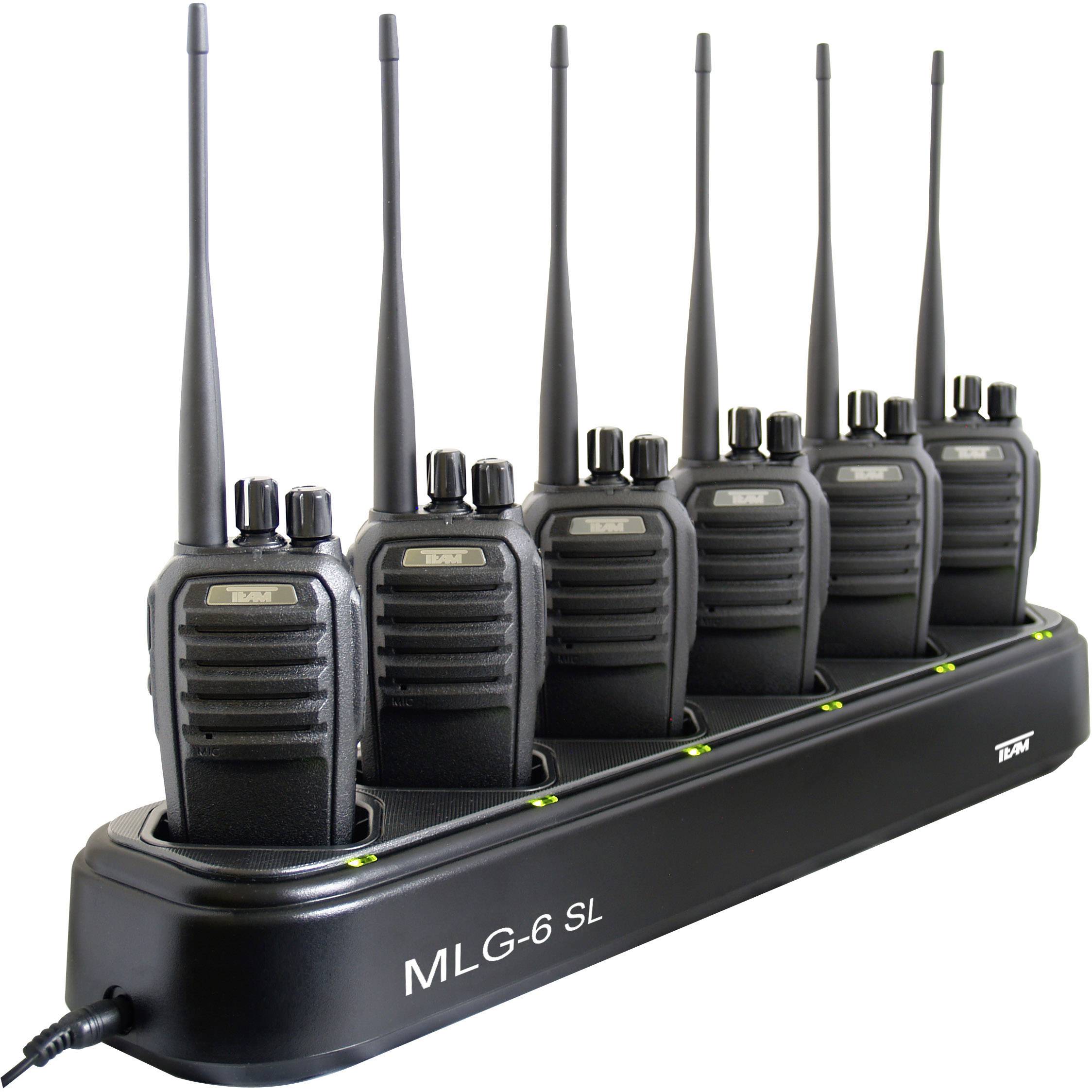 6 x TeCom-SL PMR Handfunkgerät · 6 x APP-TeCom-SL Akkupack · 6 x SLG-TeCom-SL Einzellader · 6 x Netzteil · 6 x Bedienungsanleitung · 1 x MLG-6 SL Multilade-Station.