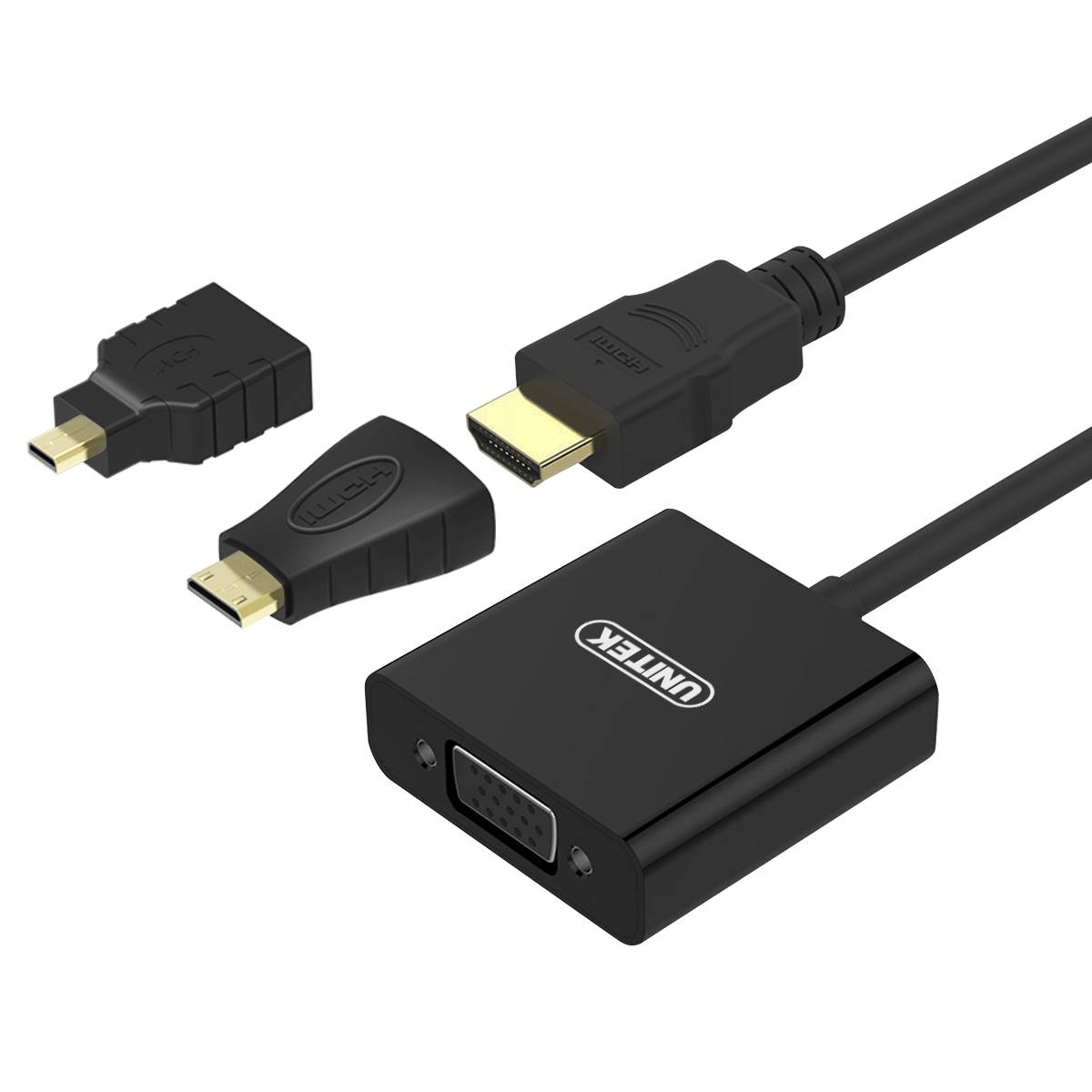UNITEK Y-6355. Anschluss 1: VGA (D-Sub), Anschluss 2: HDMI Typ A (Standard), Steckverbinder 1 Geschlecht: Männlich. Menge pro Packung: 1 Stück(e), Anschlussadapter enthalten: HDMI-weiblich - Micro-HDMI männlich, HDMI weibliche - Mini-HDMI männlich