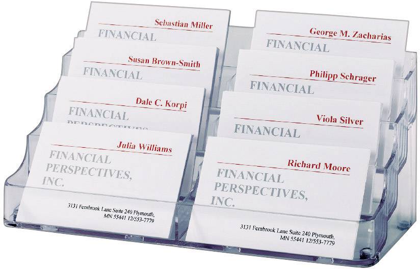 Visitenkarten-Aufsteller mit acht Fächern für die perfekte Präsentation verschiedener Visitenkarten. Standfest und rutschsicher, hochwertige glasklare Optik. Fassungsvermögen: 70 Karten bis max. 94 mm Breite.