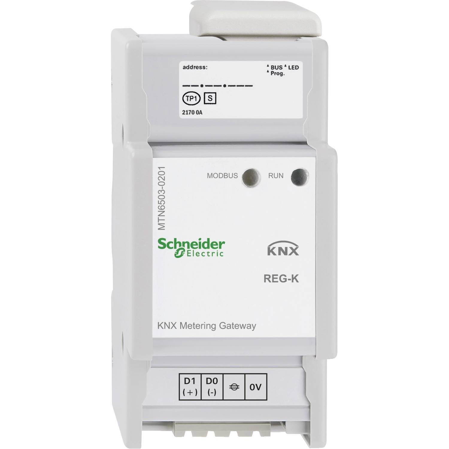 Schneider Electric KNX. Die KNX Zählerschnittstelle Modbus REG-K ist ein Gateway zwischen einer Modbus Installation und dem KNX-Bus. Das Gerät überträgt gemessene Leistungs- und Verbrauchswerte von angeschlossenen Modbus-Energiezählern auf den KNX-Bus. Diese Daten von den Energiezählern können zur Auswertung, Visualisierung oder zur Reduzierung der Energieverbräuche in Ihrer KNX-Installation verwendet werden. Es können bis zu 10 Modbus-Zähler mit RTU-Übertragungsprotokoll parallel an das Gateway angeschlossen werden. Diese Zähler senden Daten über das Gateway auf den KNX. Das Gateway arbeitet immer im Master-Modus, die angeschlossenen Modbus-Geräte arbeiten im Slave-Modus. Eine Kommunikation von KNX auf den Modbus ist nicht möglich. Die ETS-Applikation verfügt über vorprogrammierte Vorlagen für 17 verschiedene Schneider-Electric Modelle von Modbus-Zählern. Jedem angeschlossenen Modbus-Zähler kann in der ETS eine entsprechende Vorlage zugewiesen werden. Die Zuordnung der entsprechenden Modbus-Register zu den Kommunikationsobjekten auf der KNX-Seite erfolgt dann automatisch. Bei Modbus-Geräten ohne Vorlage können bis zu 40 Modbus-Register direkt den Kommunikationsobjekten auf der KNX-Seite zugeordnet. Die Spannungsversorgung des Gerätes erfolgt über den KNX-Bus. Mit integriertem Busankoppler, für die Montage auf Hutschienen TH35 nach EN 60715. Der Busanschluss erfolgt über eine Busanschlussklemme.