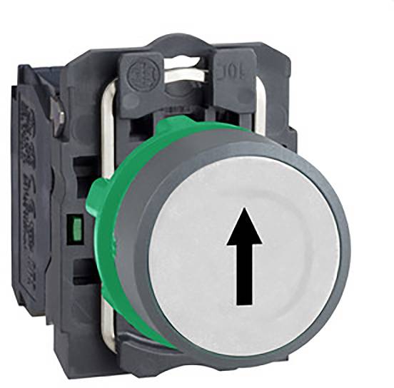 Drucktaster aus Kunststoff als Komplettgerät und 22mm Einbaumaß, Baureihe Harmony XB5. Farbe des Drucktasters ist weiss und beschriftet mit einem Pfeil nach oben. Mit 1 Schließer. Die Farbe des Außenrings ist grau. Betätigungsfunktion ist ohne Rastung. Die modularen Harmony Baureihen mit 22mm Einbaumaß kombinieren einfache Installation, Effizienz, modernes Design, Flexibilität mit höchster Robustheit. IP-Schutzklassen bis IP69K und Umgebungstemperaturen von -40°C bis +70°C. Produktstandards gem. EN/IEC 60947-5-1, EN/IEC 60947-5-4, CSA C22.2 No 14, UL 508, EN/IEC 60947-1, JIS C 4520. Zertifizierungen nach DNV, GL, UL gelistet, RINA, BV, CSA, LROS (Lloyds register of shipping). Produktstandards gem. EN/IEC 60947-5-1, EN/IEC 60947-5-4, CSA C22.2 No 14, UL 508, EN/IEC 60947-1, JIS C 4520.