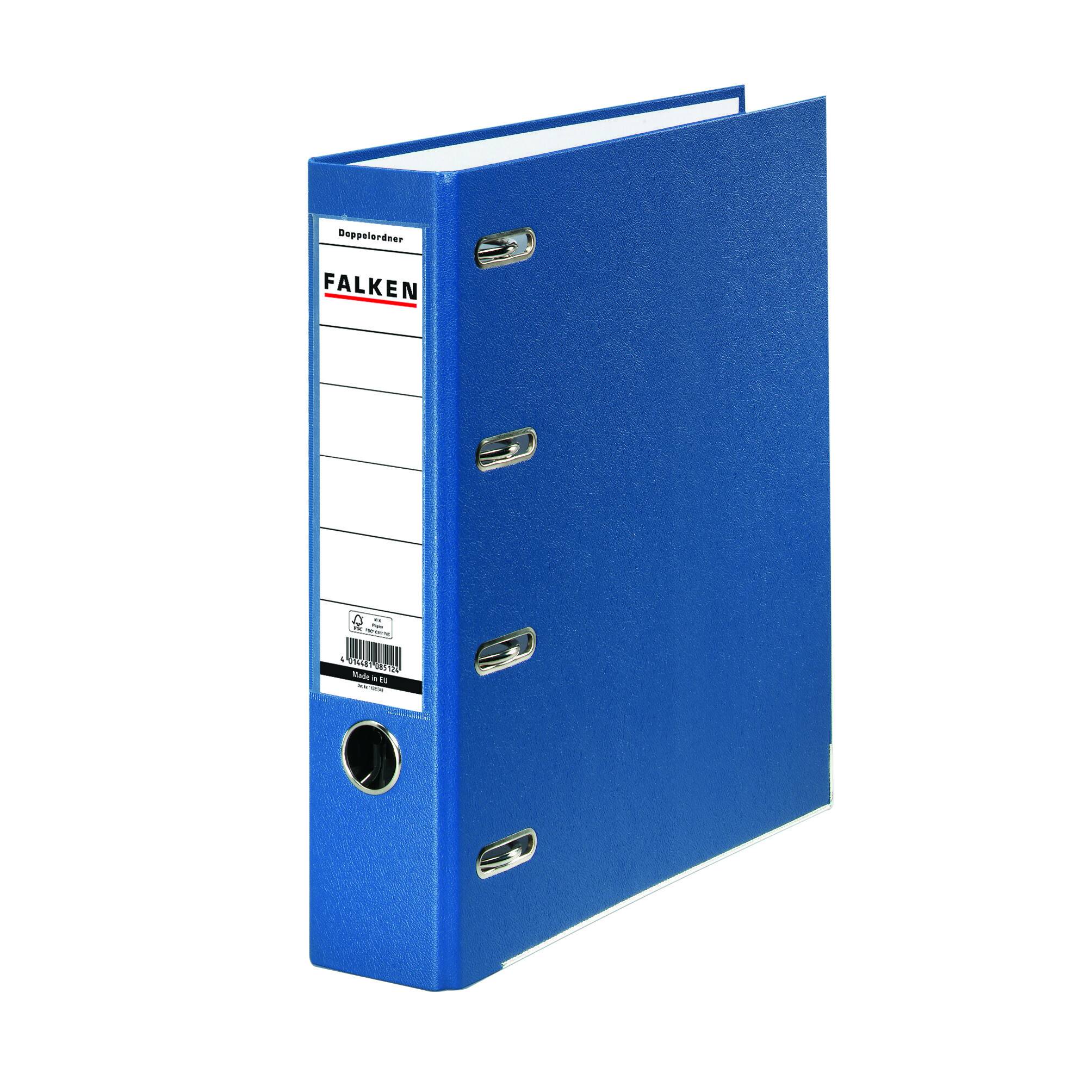 Doppelordner. Material der Kaschierung außen/innen: griffig genarbte PP-Folie/Papier. Ausführung: Sichttasche am Rücken vorhanden, Hebelmechanik, Qualitätshebelmechanik mit Funktionsgarantie, Griffloch vorhanden, Schlitze vorhanden, Kantenschutz vorhanden. Verwendung für Papierformate: 2 x DIN A5 quer. Größe (B x H): 285 x 318 mm. Breite des Rückens: 70 mm. Farbe/Farbe des Rückens: blau/blau. Zertifikate und Zulassungen: Forest Stewardship Council (FSC).