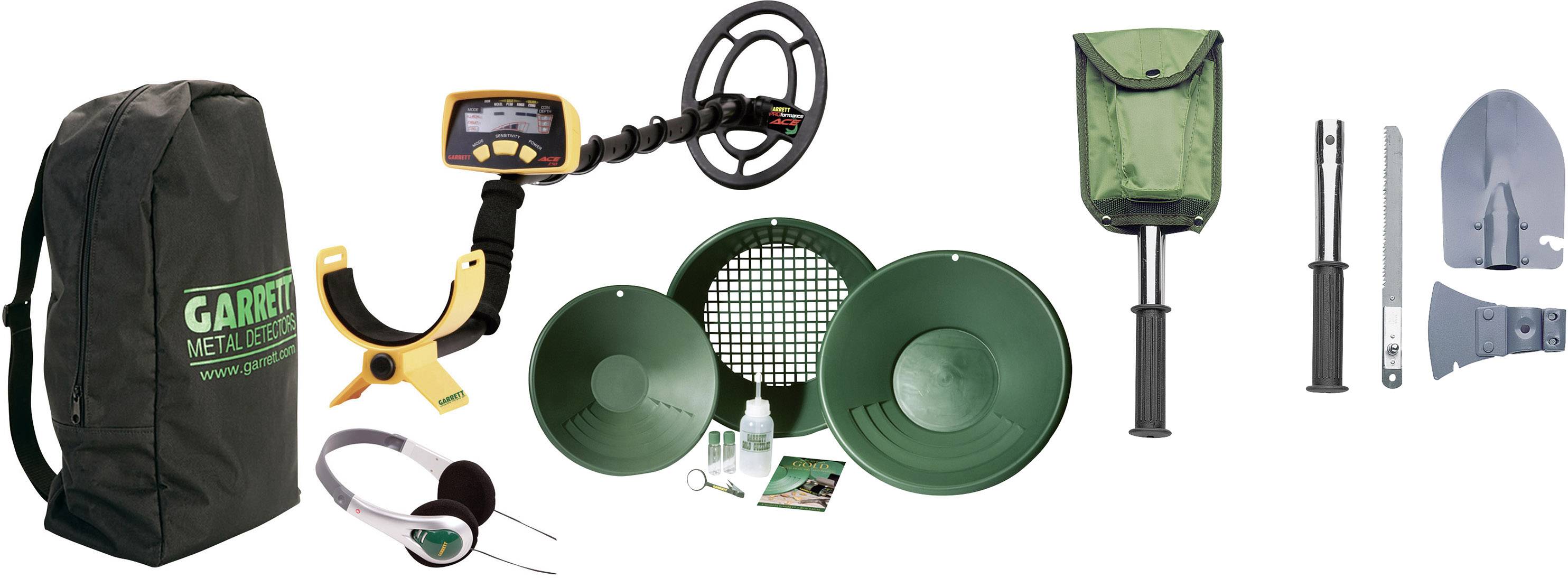 Detektor ACE150 · 17 x 23 cm PROformance Sonde · Kopfhörer · Tragetasche · 4 Mignon-Batterien · Bedienungsanleitung · Spaten mit Beil, Säge und Segeltuchtasche · 35 cm (14") Prospector Pfanne · 25 cm (10") Backpacker Pfanne · Classifier Sieb · Gold Guzzler Bottle · 2 Goldfund-Flaschen · Pinzette · Buch: "How to Find Gold" von Charles Garrett und Roy Lagal (englisch)