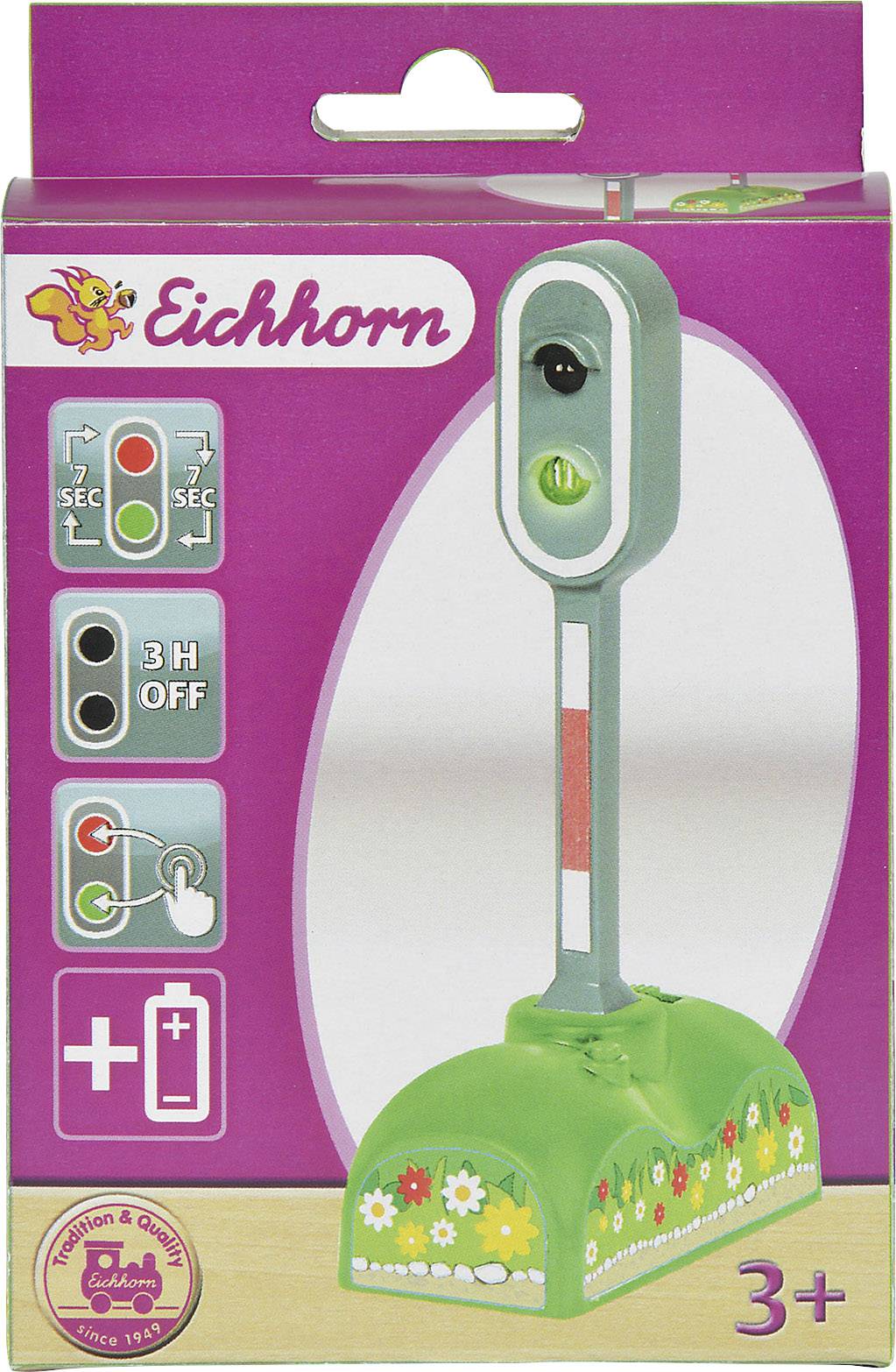 Eichhorn Bahn, Signal: Kindergerechtes, batteriebetriebenes Signal aus stabilem Kunststoff gefertigt. Beleuchtung mit einer grünen und einer roten LED. Umschaltung des Lichtsignals entweder per Knopfdruck oder nach Ablauf von 7 Sekunden automatisch. Das Batteriefach ist im Sockel des Signals integriert. 2x 1,5VR03 Batterien im Lieferumfang enthalten. Höhe des Signals ca. 12,5 cm. Die Automatische Umschaltfunktion sorgt für jede Menge Spielspaß. Für Kinder ab 3 Jahren geeignet.