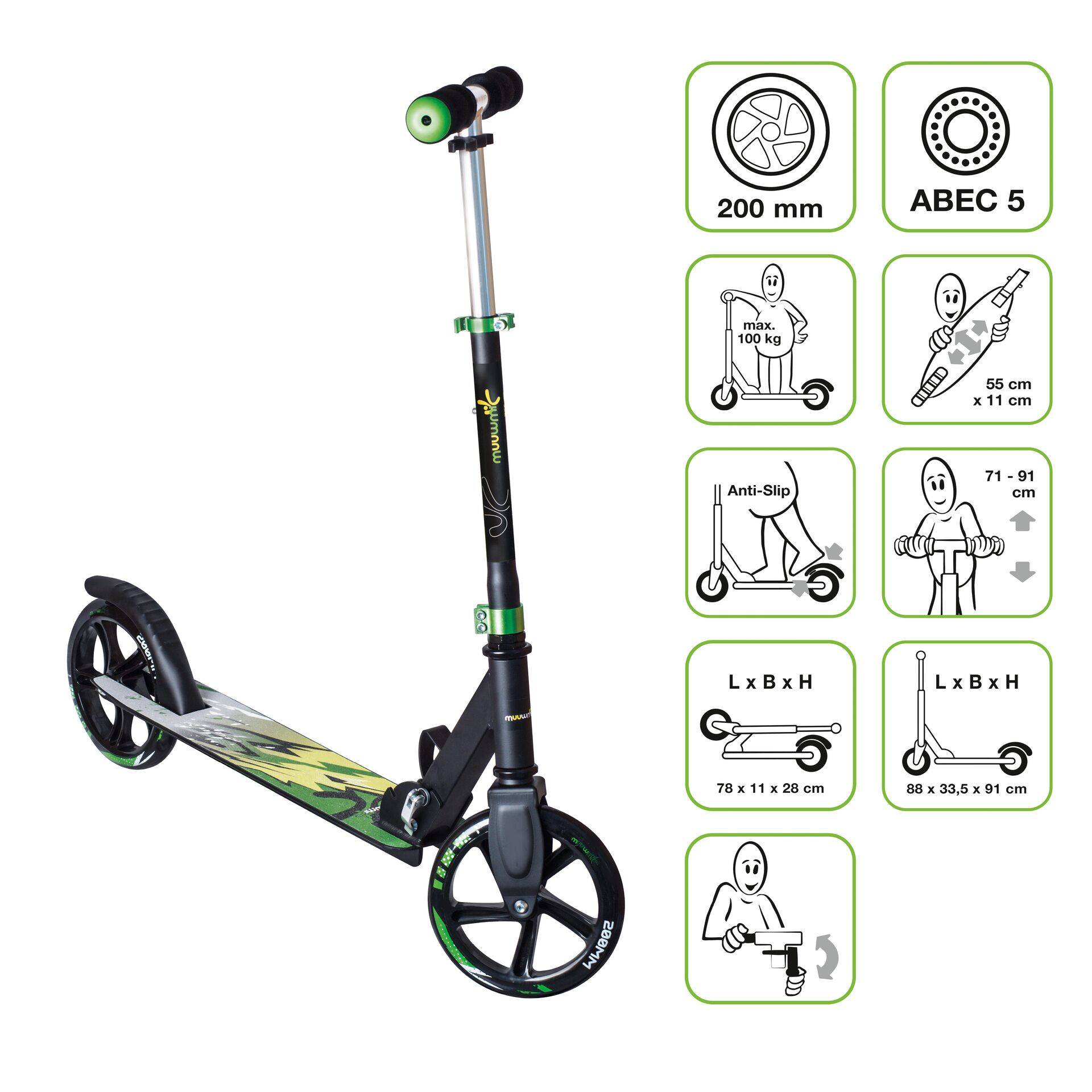 Großer Fahrkomfort: Mit einem Rollendurchmesser von 200 mm und einem ABEC 5 Kugellager sind Sie auch auf unebenem Untergrund immer komfortabel und schnell unterwegs.