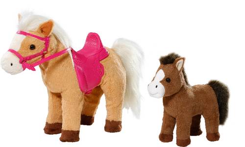 Hopp, hopp, im Galopp gehts über Kinderzimmer-Wiesen und Felder. Drückt man das linke Ohr der hübschen Pferde-Mama mit der weißen Mähne beginnt sie zu laufen. Bei Druck auf ihr rechtes Ohr wiehert sie und ruft nach ihrem braunen Fohlen. Der süße Pferdenachwuchs läuft an der Seite seiner Mama vergnügt durch die Gegend. Bewegung ist toll, aber noch viel, viel wichtiger ist Kuscheln. Pferd Sunny und ihr Baby sind total verschmust. Wenn sich beide ein Küsschen geben, also sich ihre Schnauzen berühren, ertönen Geräusche, die zeigen, wie lieb sich die beiden haben. BABY born® ist eine echte Pferdenärrin und sehr begeistert, dass Sunny Nachwuchs bekommen hat. Mit pinkfarbenem Sattel und Zaumzeug kann sie die beiden auf ihren Reitausflügen begleiten. Batterien enthalten. Ab 3 Jahren. Hochwertiges Zubehör für die BABY born® Markenspielpuppe Für erweitertes, abwechslungsreiches und lang anhaltendes Spielvergnügen Batterien nötig (im Lieferumfang enthalten) BABY born® Interactive Pferd Sunny inkl. Sattel und Zaumzeug mit Fohlen mit Bewegung und Soundeffekten.