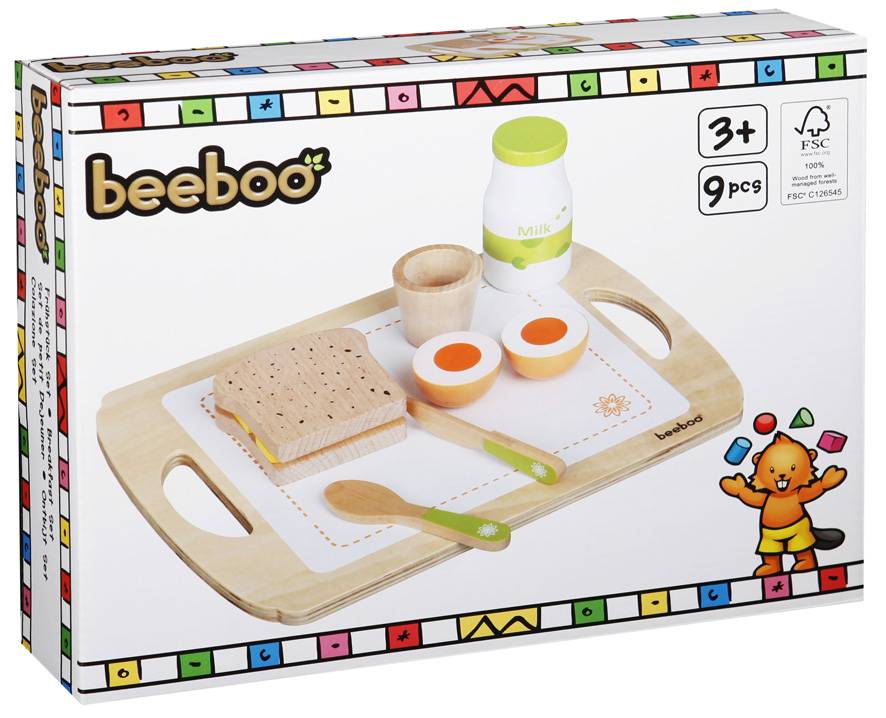 Beeboo Frühstücksbrett mit Zubehör. Aus 100% FSC Holz. Das Zubehör besteht aus 1 Becher, 1 Flasche Milch, 2 Hälften Ei, 1 Toast, 1 Scheibe Käse, 1 Löffel und 1 Messer. Maße: 26x19x0,9cm. Für Kinder ab 3 Jahren.