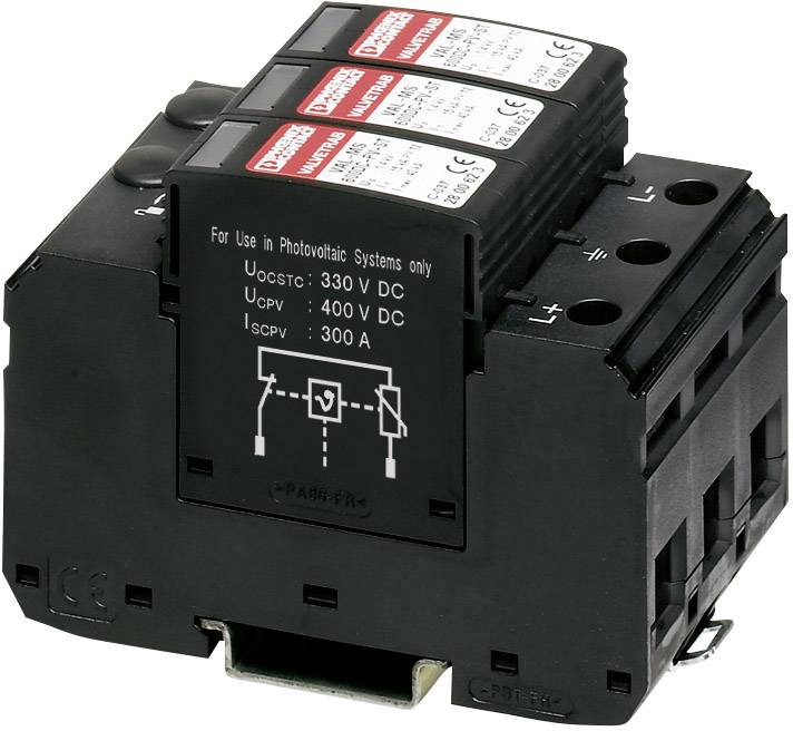 Überspannungsableiter für 2-polige isolierte Gleichspannungssysteme 600 V DC, für Tragschienenmontage, 3-poliges Basiselement, drei steckbare temperaturüberwachte Schutzelemente, Statusmeldung an jedem Stecker.