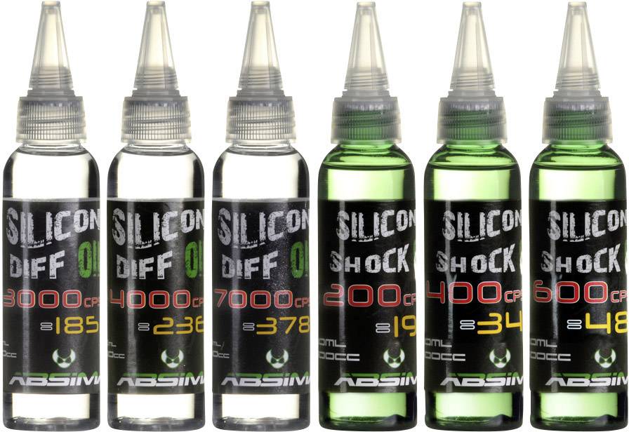 je 1 Stk. 60ml Flasche Öldruckstoßdämpfer Befüllung in den Viskositäten 200 cbs (19 WT), 400 cbs (34 WT) und 600 cbs (48 WT)/ je 1 Stk. 60ml Differential Befüllung in den Viskositäten 3000 cbs (185 WT), 4000 cbs (236) und 7000 cbs (378 WT).