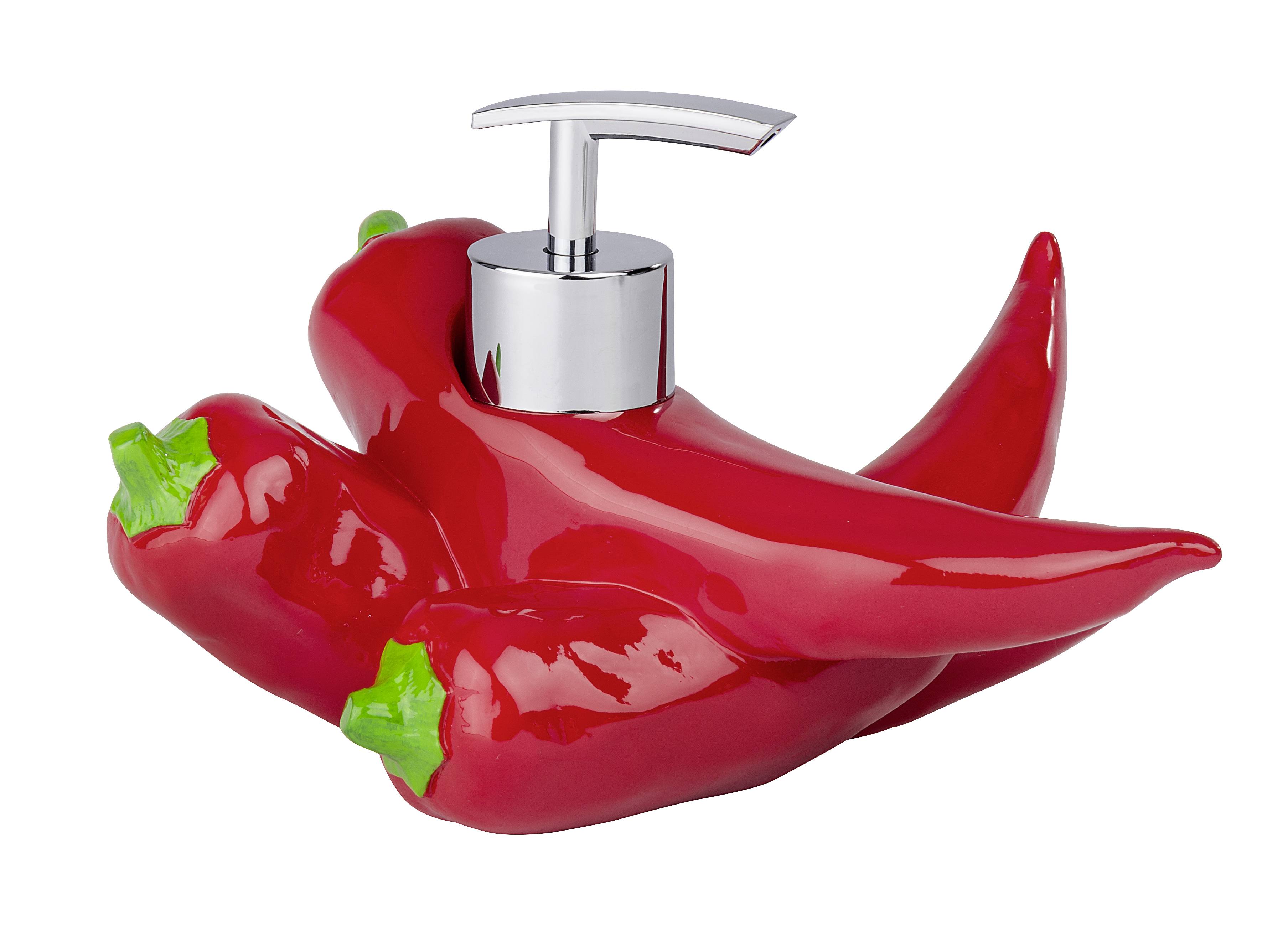 Der ausgefallene Seifen- und Spülmittelspender Peperoni setzt scharfe Akzente in Küche, Bad und Gäste-WC. Die hochglanzverchromte Kunststoffpumpe kombiniert mit dem hochwertigen Polyresin sorgt für ein besonderes Ambiente an Spül- und Waschbecken.