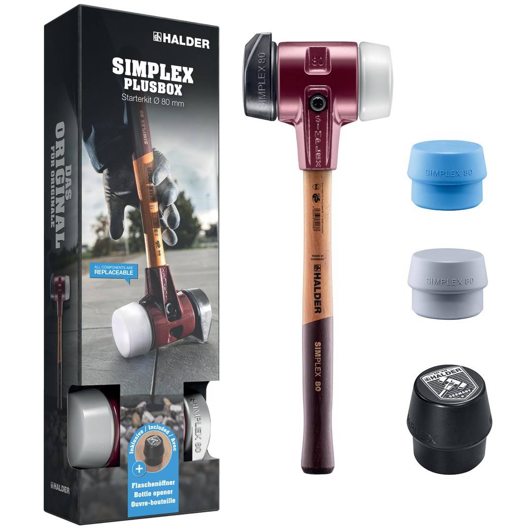 Das perfekte SIMPLEX Starterkit, verbindet Arbeit und Feierabend. Diese SIMPLEX-Plusbox Starterkit enthält den SIMPLEX-Schonhammer D80, Gummikomposition mit Standfuß / Superplastik sowie je ein TPE-soft und TPE-mid Schlageinsatz plus einen SIMPLEX-Push Flaschenöffner. Der SIMPLEX-Schonhammer D60mm mit der Einsatzkombination Gummikomposition / Superplastik ist ein unentbehrlicher Begleiter für eine Vielzahl von Anwendungen. Dieser Topseller aus dem Hause Halder wurde nun weiterentwickelt: Der Superplastik-Einsatz ermöglicht eine höhere Schlagkraft als der Gummi-Einsatz. Zusätzlich sind in dieser Aktionsbox je ein Ersatz-Einsatz TPE-soft (weich, abriebfrei) und TPE-mid (mittelhart, abriebfrei) enthalten, die das Verlegen von Natursteinen und bruchempfindlichen Platten aber auch das Positionieren von Balken ohne lästige schwarze Gummirückstände ermöglichen. Der SIMPLEX-Push Flaschenöffner im Design eines SIMPLEX-Einsatzes, überzeugt durch die besondere Öffnungstechnik: Einfach den Flaschenöffner auf die Flasche setzen, leicht nach unten drücken und schon ist die Flasche geöffnet. Produktmerkmale: Anwendungsgebiete: Maße: