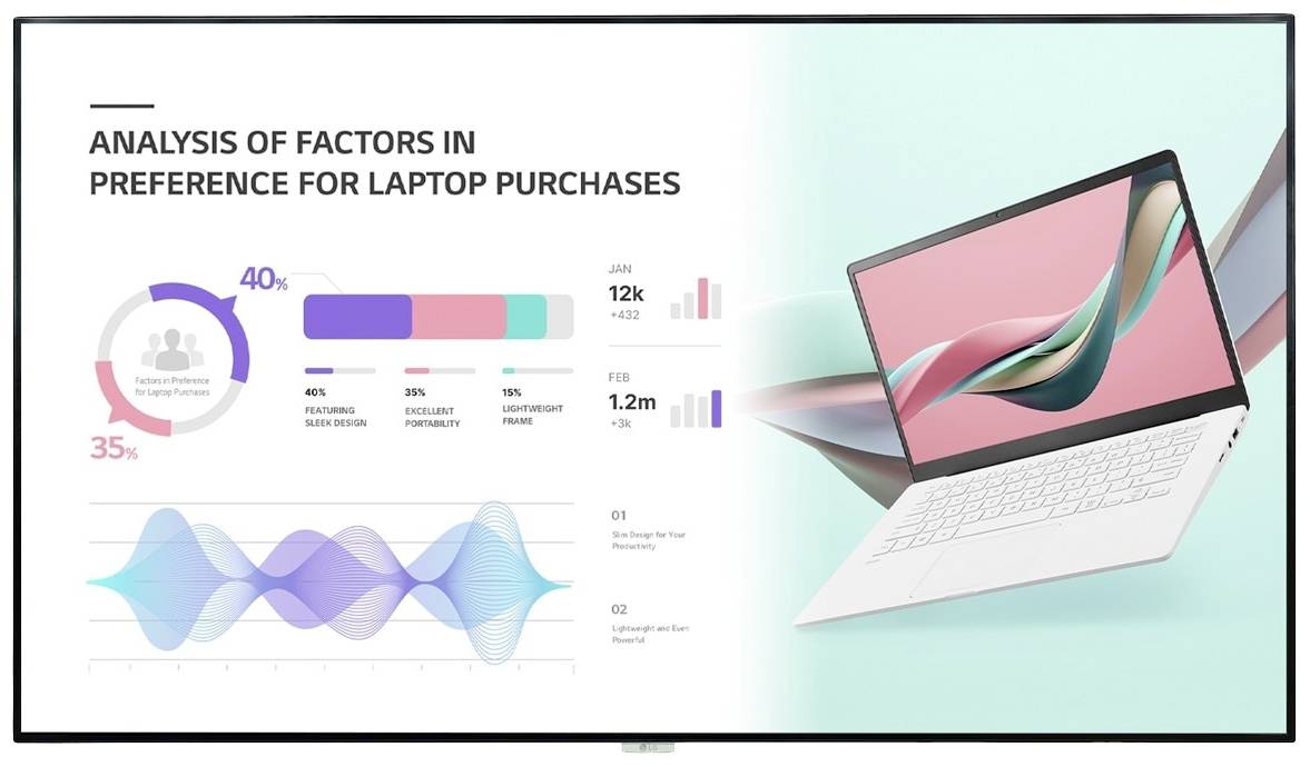 Mit einer empfohlenen Helligkeit von 500 cd/m² für die Anzeige in Innenräumen stellt die UH5J-H-Serie Inhalte klar und deutlich dar und zieht die Aufmerksamkeit des Publikums auf sich. Damit ist sie das am besten geeignete Display für das Marketing in Konferenzräumen, Flughäfen, im Einzelhandel, in Einkaufszentren usw.