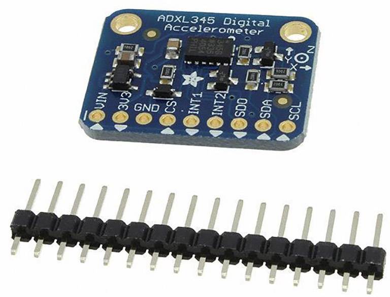 Der digitale 3-Achsen-Beschleunigungssensor ADXL345 von Analog Devices besitzt Ausführungen für die digitalen Schnittstellen I²C und SPI. Ein 3,3 V Regler auf der Platine und eine Schaltung zur Umwandung der Logikpegel machen die Platine ideal zur Einbindung mit einem 3 V oder 5 V Mikrocontroller wie dem Arduino®. Die Empfindlichkeit der drei Messachsen X, Y und Z ist einstellbar auf die Bereiche ±2 g, ±4 g, ±8 g oder ±16 g. Der Regler kann mit bis zu 5 V am Eingang gespeisst werden und regelt diese auf 3,3 V am Ausgang. Komplett montiert und getestet besitzt das Board zwei 2,54 mm Befestigungslöcher zur einfachen Befestigung und eine gewöhnliche 9-polige Stiftleiste, die mit einem Steckbrett oder einer Lochrasterplatine benutzt werden können.
