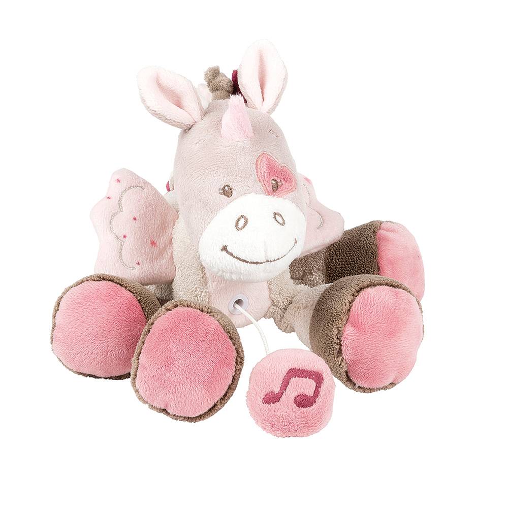 Die Mini-Spieluhr lädt mit der Melodie La-Le-Lu zum Träumen ein. Das Pferdchen besteht aus weichem Nicki-Stoff und kann mit Bindebändern am Bettchen, an der Wippe oder an der Babyschale befestigt werden. Besonders praktisch für unterwegs, da sie klein und handlich ist. Alle Nattou - Produkte werden mit viel Liebe zum Detail entworfen, hochwertig und in schönen Farben verarbeitet.
