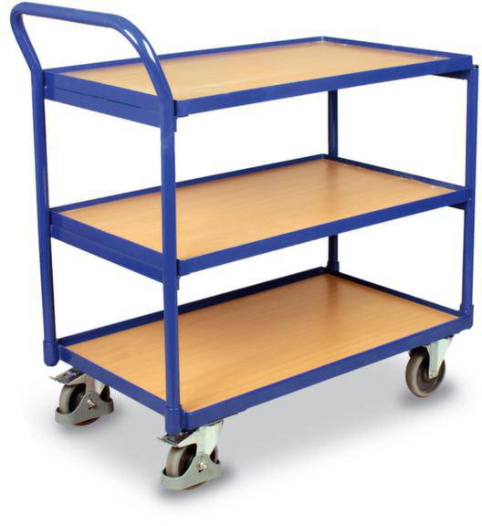 Tischwagen - 3 Etagen mit Holzböden Etagen: - Holzwerkstoffplatte in Buchedekor - Im Winkelstahlrahmen liegend, Rand 12 mm hoch - Traglast mittlere und obere Etagen 80 kg - Etagenhöhe 230/540/850 mm. Gestell: - Geschweißte Stahlkonstruktion - Oberfläche pulverbeschichtet - Dauerhaft oberflächengeschützt, schlag- und kratzfest - Schiebegriff hochstehend. Bereifung: - 1 Lenk- und 2 Bockrollen mit spurloser thermoplastischer Gummi-Bereifung Ø 125 mm - Lenkrollen mit Feststellern und Fußschutz - Naben mit Kugellager.
