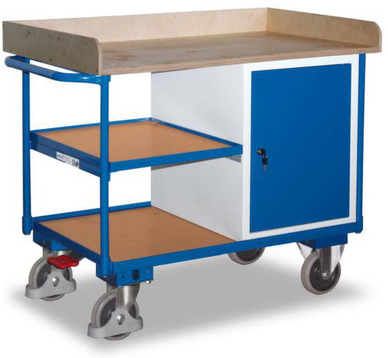 Tisch- und Schrankwagen - Traglast 400 kg Ladefläche: - Arbeitsplatte aus 18 mm starkem Buchensperrholz mit 3seitiger, 80 mm hoher Umrandung - Arbeitshöhe 850 mm. Ausstattung: Schrankfach: - 1 Schrank - Abschließbar - 3 Etagen - Schrank HxBxT 600x490x600 mm - Schrank mit 2 verstellbaren Böden aus verzinktem Stahlblech - Traglast pro Boden 30 kg - Flügeltür mit Zylinderschloss inkl. 2 Schlüssel. Gestell: - Geschweißte Stahlkonstruktion - Oberfläche pulverbeschichtet - Dauerhaft oberflächengeschützt, schlag- und kratzfest. Bereifung: - 2 Lenk- und 2 Bockrollen mit spurloser thermoplastischer Gummi-Bereifung Ø 125 mm - Lenkrollen mit Feststellern und Fußschutz. Zentrales Fußbremssystem Easy STOP - Blockierung beider Lenkräder mit einem Pedal - Feststellen in jeder Radstellung möglich - Einfache Betätigung, auch mit Sicherheitsschuhen - Einstellbare Bremswirkung - Abbremsmöglichkeit des Wagens während der Fahrt - Naben mit Kugellager.