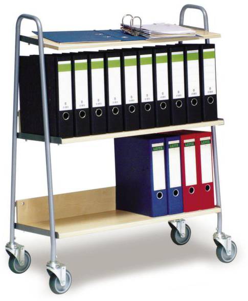 Ordnerwagen - Traglast 120 kg Etagen: - 2 Etagen für jeweils 10 Ordner mit einer Rückenbreite von 80 mm. Gestell: - Gestell aus Stahlrohr, pulverbeschichtet - Dauerhaft oberflächengeschützt, schlag- und kratzfest. Bereifung: - 4 Lenkrollen mit spurloser Vollgummi-Bereifung, Ø 100 mm.