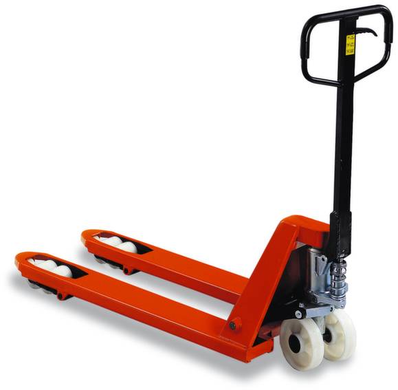 Traglast 2500 kg, Aus Stahl mit Pulverbeschichtung, Gabeln für verwindungsfreie Stabilität aus einem Stück gepresst, Zugstange aus Rechteckprofil mit zusätzlicher Verstärkung an den Halterungen zur Hydraulik, Verstärkte Deichsel mit ergonomischem Deichselgriff, der die Funktionen Heben-Fahren-Senken beinhaltet, Die gefederte Deichsel kehrt beim Loslassen automatisch in die senkrechte Stellung zurück, Geringe Pumpkraft durch optimierte Pumpkraftgeometrie, Stufenlos regulierbare Senkgeschwindigkeit gewährleistet fein dosiertes Absetzen, Die Dichtungen wurden speziell entwickelt und halten mit 800 bar einen weit überdurchschnittlichen Druck aus, Die Kolben sind gehärtet, verchromt und poliert, Die Hydraulik ist außen verzinkt und mit einem Messingventil zur höheren Korrosionsbeständigkeit ausgestattet, Jede Hydraulik ist einzeln auf Funktion geprüft. , Das Hydrauliköl arbeitet im Temperaturbereich von -35° bis +85° C und ist somit für Kühlhäuser geeignet, Ein Überlastventil schützt vor Überladung, Rollen: Lenkräder Nylon, Gabelrollen Nylon, tandem, Lenkräder Ø x B = 200 x 50 mm, Gabelrollen Ø x B = 82 x 70 mm, Kletterrollen an den Gabelspitzen.