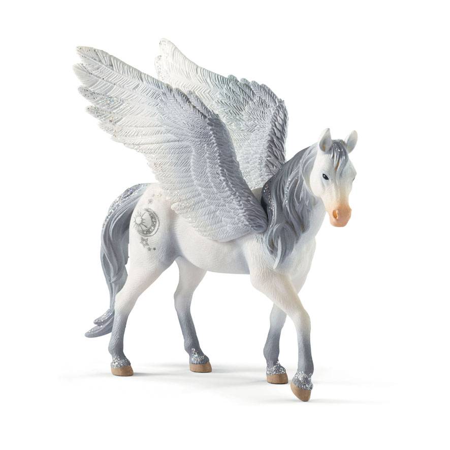 Nur noch ein Flügelschlag, dann hebt das fliegende Pferd vom Boden ab und entschwindet bald darauf mit einem Glitzerstreif am Horizont. Kein Wesen in ganz bayala fliegt so hoch und so schnell wie ein Pegasus. Und kaum ein Geschöpf ist so edel und schön. Wenn man ihn am Himmel erblickt, sieht er aus wie ein funkelnder Stern. Fast noch nie hat er einer Elfe erlaubt, auf ihm zu reiten. Nur die Auserwählten dürfen auf seinem Rücken sitzen und unvorstellbar schnell von einem zum anderen Ort gelangen.