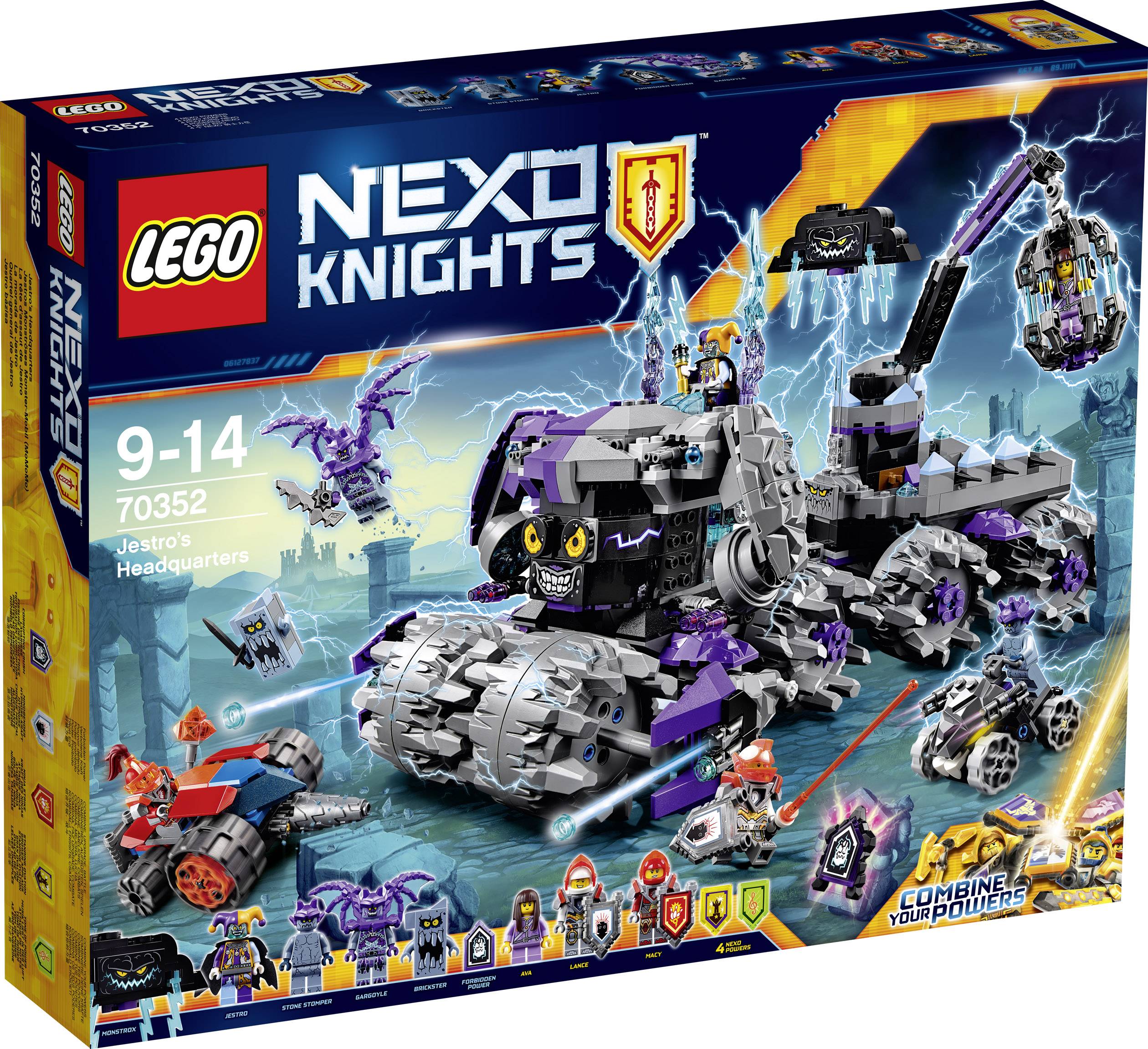 Starte eine waghalsige Rettungsmission und befreie Ava aus Jestros MoMoMo. Das Monster-Mobil verfügt über eine Riesenfratze mit verborgener Ausrüstung, einen abkoppelbaren Hutwerfer mit Raketen und einen Anhänger mit Mobilem Steinturm. Auf dem Anhänger befinden sich auch ein verstellbarer Kran mit einem Käfig, dessen Gitterstäbe bewegt werden können, und eine Funktion, um ein Steinboot losschnellen zu lassen. Dieses LEGO® NEXO KNIGHTS™ Set strotzt nur so vor Funktionen und enthält zudem Macys Buddler mit einem drehenden Bohrer sowie ein Steingefährt mit Kanonen, um die Rettungsmission noch spannender zu machen. Enthält fünf Schilde zum Scannen und sechs Minifiguren.