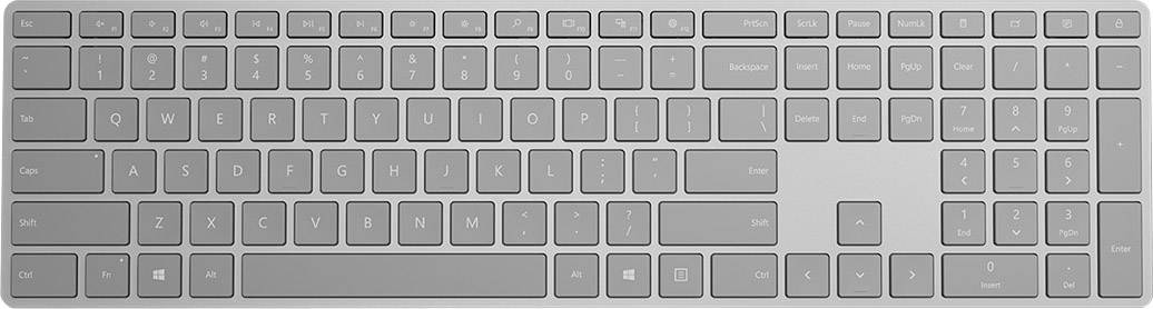 Mit ihrer weichen, grauen Beschichtung vervollständigt die Tastatur Ihr Surface-Gerät perfekt. Da die einzelnen Tasten in angenehmem Abstand voneinander platziert wurden, haben Sie beim Tippen – das schnell, ruhig und nahtlos vonstatten geht – ein solides Gefühl unter Ihren Fingern. Mit der Bluetooth-Funktechnologie entsteht eine harmonische Symbiose zwischen der Tastatur und Ihrem Surface. Aufgrund ihres peniblen Designs positioniert sich die Surface Tastatur in der Spitzenklasse und rundet Ihren durchdachten Arbeitsplatz ab.