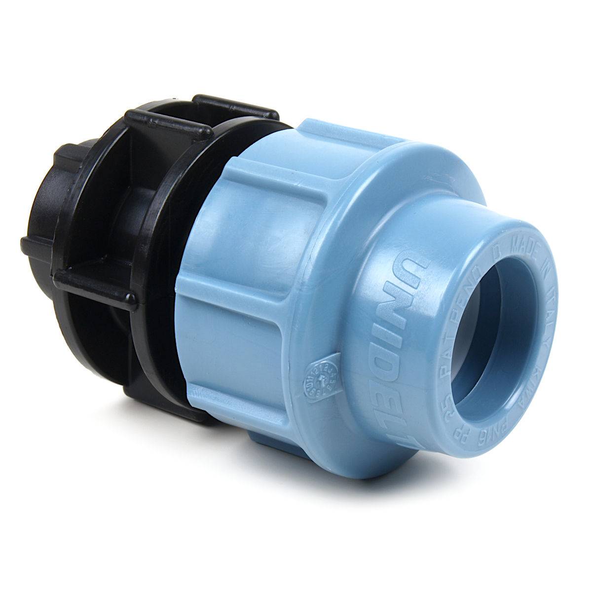 PE-Übergangskupplung mit einem Innengewinde und einer Klemmmuffe für PE-Rohr. Auf der Gewindeseite kann jedes beliebige Kunststofffitting mit einem entsprechenden Außengewinde aufgeschraubt werden. Zum Abdichten des Gewindes benötigen Sie zusätzlich ein geeignetes Gewindedichtmaterial. Für Kunststofffittings eignet sich Teflonband. Alle von uns angebotenen PE-Kuppplungen sind für einen Betriebsdruck von 16 bar und für den professionellen Einsatz im Industriebereich ausgelegt. Alle Innengewinde ab einem Durchmesser von 1 1/4" sind zusätzlich mit einem verstärkenden Metallring ausgestattet, welcher ein Aufplatzen des Gewindes verhindert.