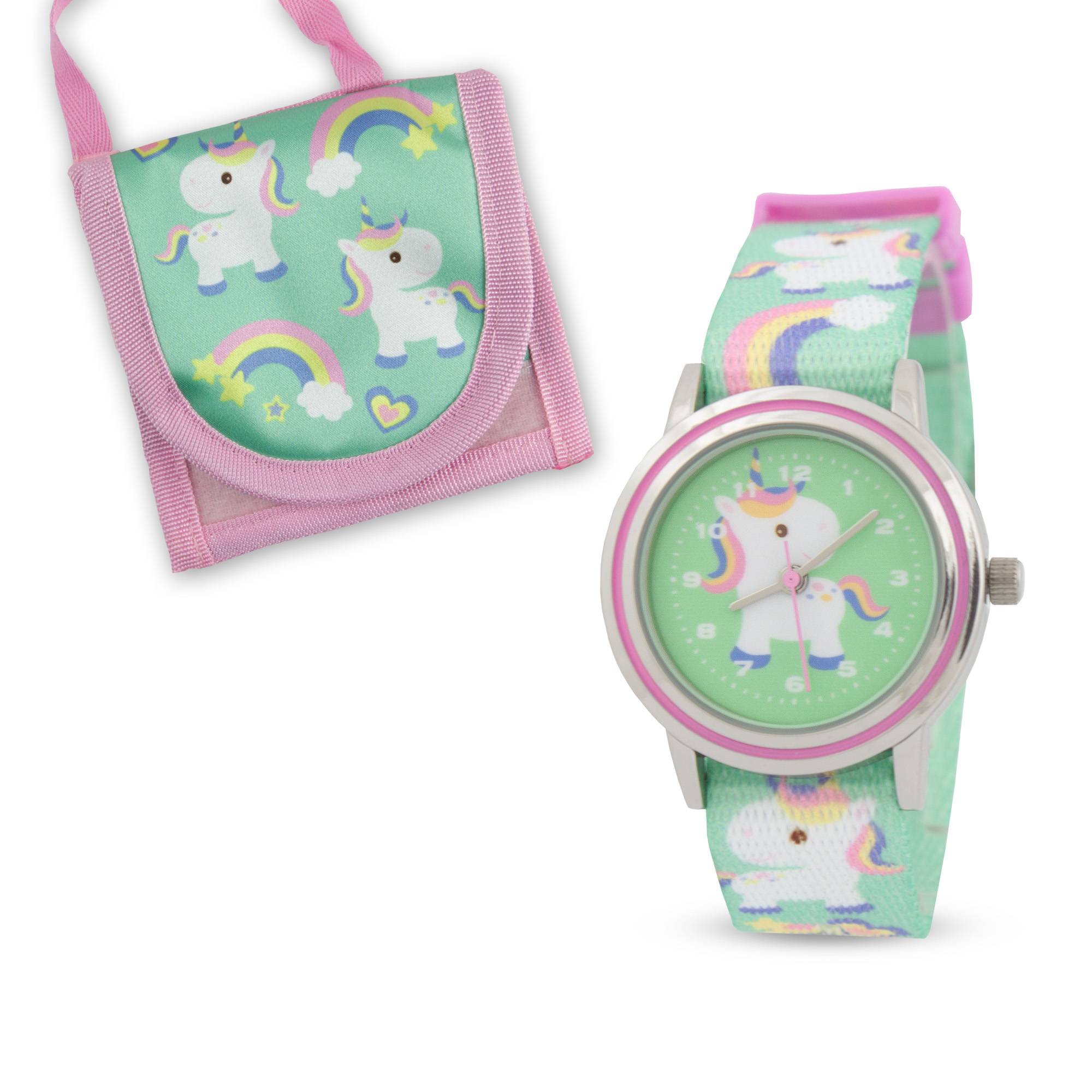 Kinderarmbanduhr mit Brustbeutel Textilarmband Einhornmotiv für Mädchen Einschulung
