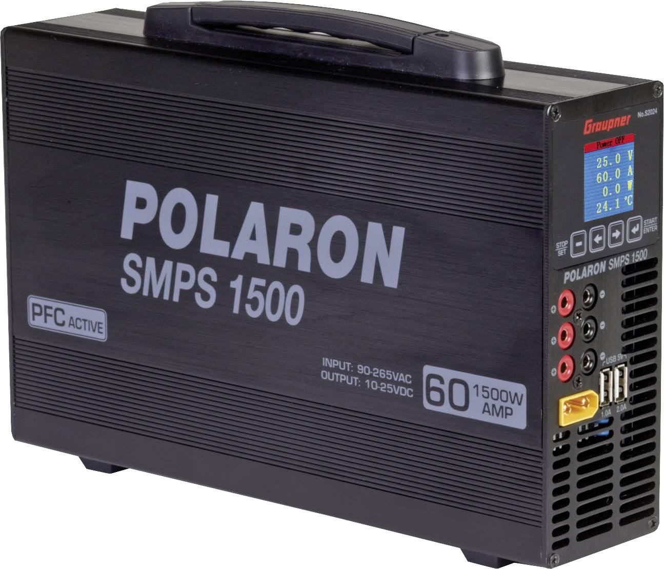 Das neue Graupner Polaron SMPS 1500 Netzteil ist ein Mikroprozessor gesteuertes Schaltnetzteil, das die ausgezeichnete Leistung von 1500 W bei 25 V und einen Ausgangsstrom von bis zu 60 A liefert. Somit eignet sich das SMPS 1500 hervorragend für die Graupner Polaron Ladegeräte, zum