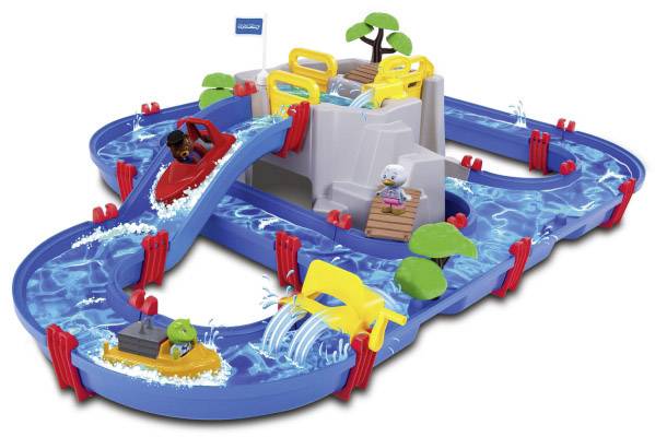 Dieses große Wasserbahnsystem mit der neuen Spielfunktion begeistert die Kinder. Es gibt einen großen Berg mit einem See, und die drei Tierfiguren Lotta die Ente, Nils der Frosch und Bo der Bär erkunden gemeinsam die geheimnisvolle Höhle des Berges und besteigen die steilen Klippen auf der Suche nach einem Schatz. Und die besonders mutigen Kinder lassen das Schnellboot den Wasserfall hinunterfahren, aber Achtung, dass der Container dabei nicht über Bord geht. Durch das Drehen des Paddelrades fließt das Wasser durch den Kanal und die Strömung für die Bewegung wird erzeugt. Mit dem Set AquaPlay MountainLake kommt Abenteuerfeeling in den heimischen Garten. Denn dieses große Spielset enthält einen hohen Berg mit Stausee, zwei Boote und drei süße Tierfiguren: die Ente „Lotta", den Frosch „Nils" und den Bären „Bo". Gemeinsam mit den drei Freunden können die Kinder tiefe Bergseen durchqueren, wilde Wasserfälle hinunterfahren und wertvolle Schätze suchen. Im Spiel lernen die Kinder dadurch das Element Wasser kennen und sehen, wie Strömungen entstehen, sich deren Richtung ändern lässt und Wasser Schiffe anhebt. Durch Pumpen gelangen die Boote im großen Bergsee mit Schleuse nach oben und können danach problemlos die Schleuse passieren und den Berg hinabfahren. Bo, der Kapitän fährt mit seinem Containerboot, durch die Kanäle. Währenddessen verstecken sich die Lotta und Nils unter dem Berg oder gehen mit ihrem Boot auf Tour. Die nötige Strömung und die richtige Fahrtrichtung können die kleinen Spieler durch die leicht zu drehende Handkurbel mit großen Schaufelflächen bestimmen. Verschiedene Bäume, Brücken und lange Wasserstraßen sorgen für ein langes Spielvergnügen.