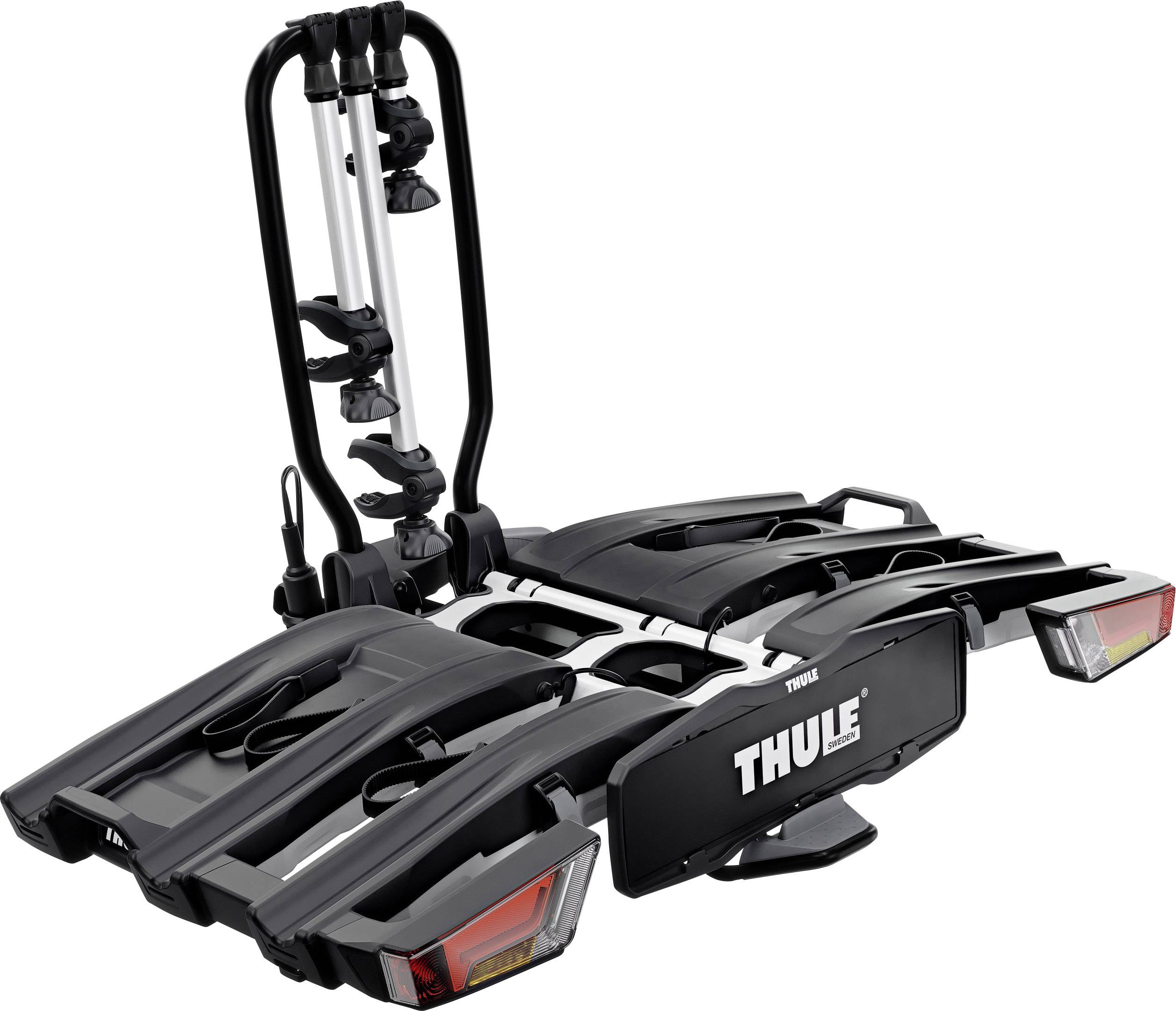 Komplett zusammenklappbar für bequeme Montage, Handhabung und Lagerung · Hohe Ladekapazität ermöglicht den Transport von E-Bikes und schweren Mountainbikes · Einfache Befestigung der Fahrräder durch abnehmbare Rahmenhalter mit Thule AcuTight Drehmomentbegrenzer-Knöpfen, die klicken, wenn das optimale Drehmoment erreicht ist · Großer Abstand zwischen den Felgenhaltern ermöglicht den Transport von Fahrrädern mit¬ großem Radstand · Extralange Felgenhaltebänder mit Ratschenfunktion gestatten die einfache Befestigung von Rädern (Radbreite bis 4,7 Zoll), wodurch auch der Transport von Fatbikes möglich ist · Praktischer Abklappmechanismus mit Fußpedal ermöglicht einfachen Zugang zum Kofferraum, selbst mit Fahrrädern auf dem Träger · Einfache Montage und Einstellung des Trägers vor dem Schließen des Spannhebels dank der stabilen Verbindung zur Anhängekupplung · Version für 3 Fahrräder: ergonomischer Transport des Trägers dank integrierter Transportrollen und Tragegriffe · Vormontiert, kein Werkzeug erforderlich · Schließen Sie Ihre Fahrräder am Träger und den Träger an der Anhängekupplung ab (Schlösser sind im Lieferumfang enthalten)