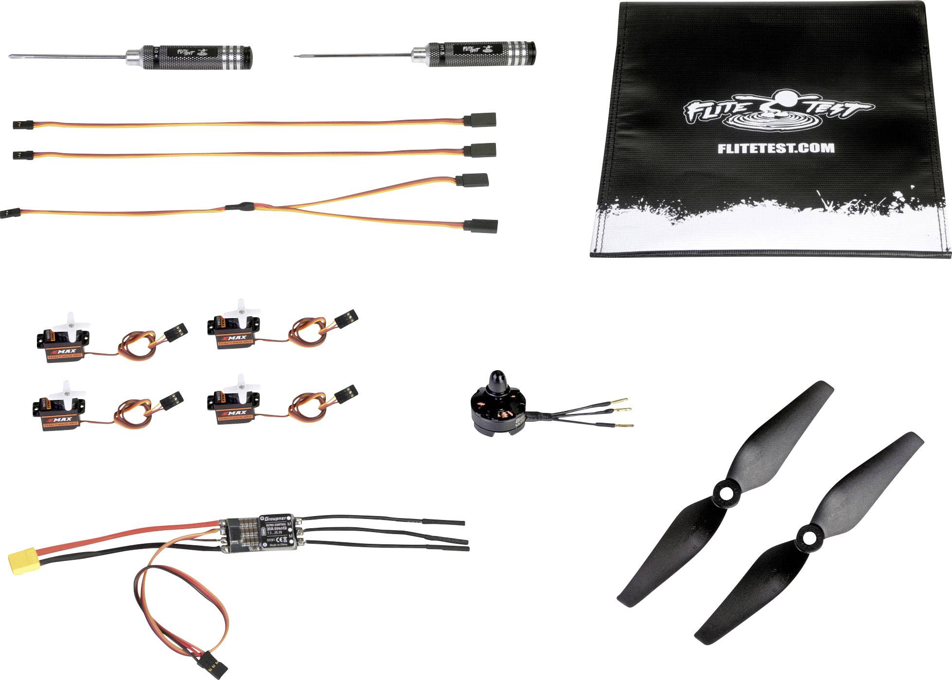 Flite Test LiPo Aufbewahrungs-Tasche · 4x Gestängeanschlüsse · 1x Y-Kabel 300 mm · 2x Verlängerungskabel 200 mm · 1x Innensechskant-Steckschlüssel 2 mm · 1x Kreuzschlitz-Schraubendreher · 1x Motor ULTRA 2804 2300KV brushless Motor CCW · 1x Regler ULTRA 20 A SBEC BL HELI S 2-4S XT-