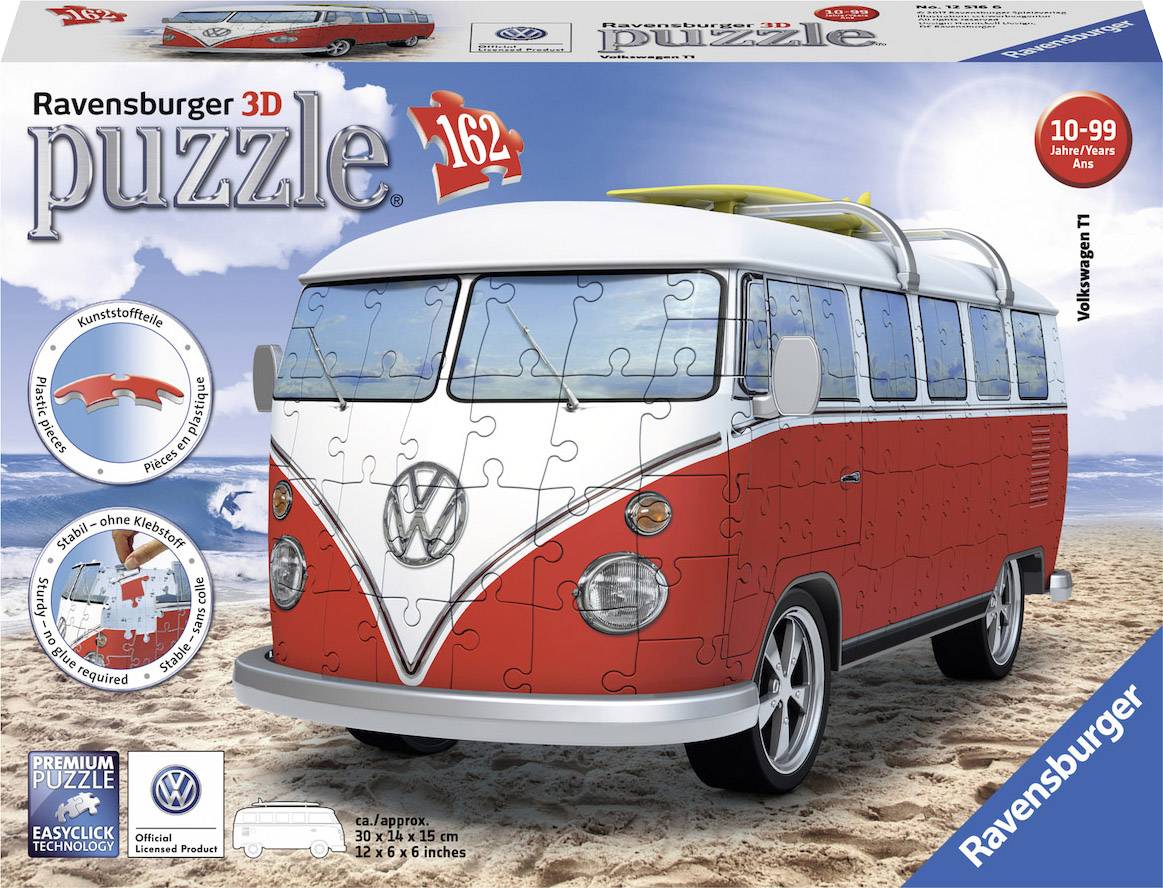 Der T1 im 3D-Puzzle-Kompaktformat: Das ist das ultimative Geschenk für Surfer, Abenteurer und all jene, deren Leidenschaft die Ferne und das individuelle Reisen sind. Der originalgetreue Volkswagen T1 im Miniaturformat entsteht aus 162 stabilen Kunststoff-Puzzleteilen. Dabei passen die individuell geformten, teils knickbaren Puzzleteile dank Easyclick Technology perfekt ineinander und formen in Zusammenhang mit den ergänzenden Zubehörteilen ein stabiles dreidimensionales Fahrzeug, ganz ohne Kleben.