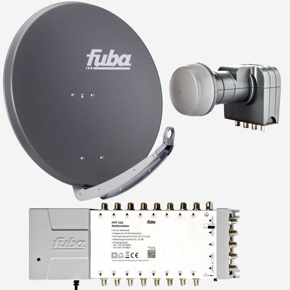 Komplettset bestehend aus Fuba DAA 850 A Sat-Schüssel Alu anthrazit, Fuba DEK 407 Quattro LNB und Fuba FMT 516 Multischalter 16 Teilnehmer/Sat-Receiver