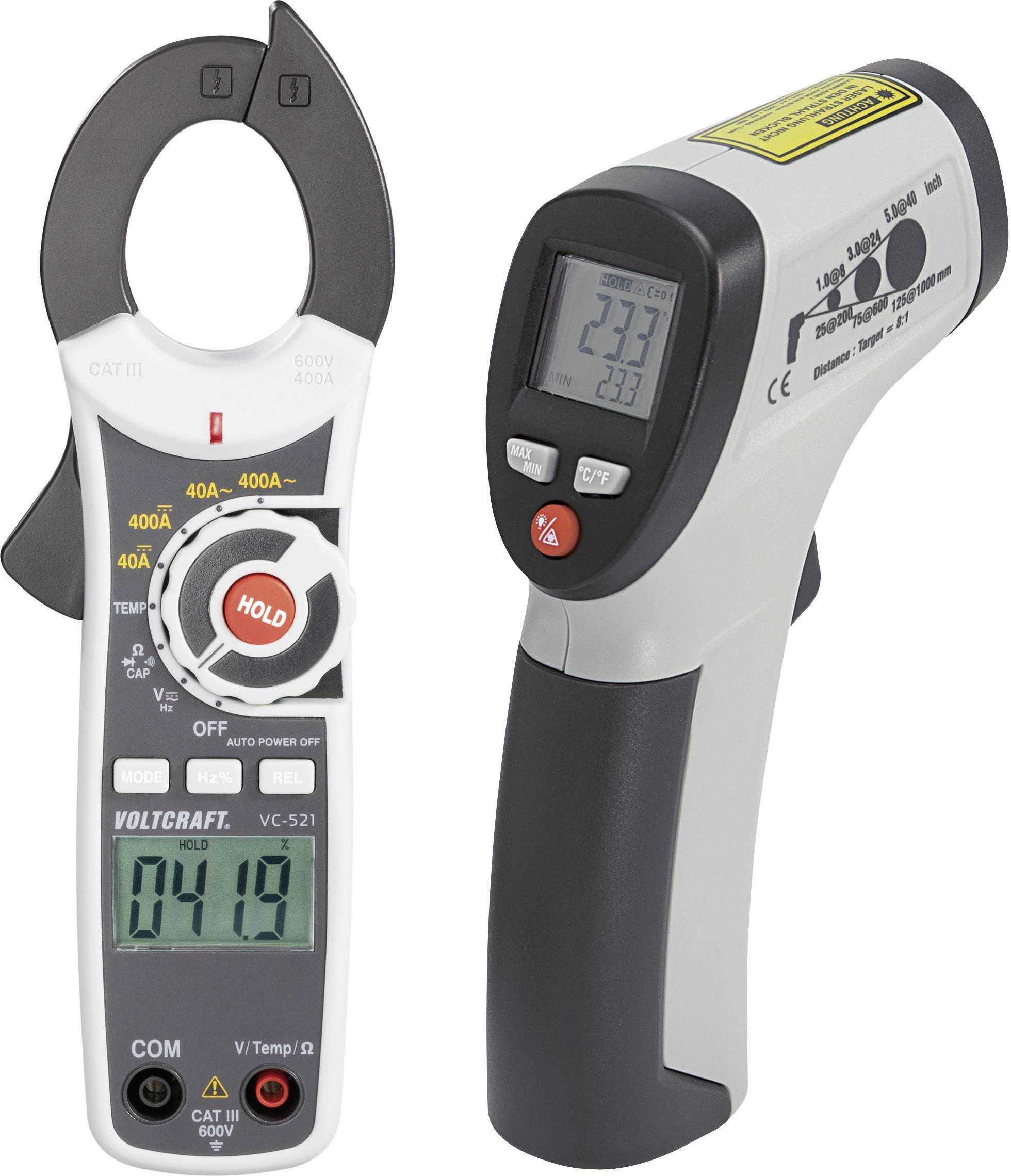 Praktisches Vorteilsset zum Prüfen von Strömen, Spannungen, Widerständen, Durchgang und Temperaturen. Die kompakte Stromzange VC-521 ermöglicht Gleich- und Wechseltrommessungen ohne Auftrennen der Leitung, Messung von Spannungen, Widerständen, Durchgang, Kapazitäten und Temperaturen mit Kontaktfühler. Das Infrarot-Thermometer IR 260-8S ist das ideale Messgerät zur schnellen, zerstörungsfreien und berührungslosen Temperaturmessung.