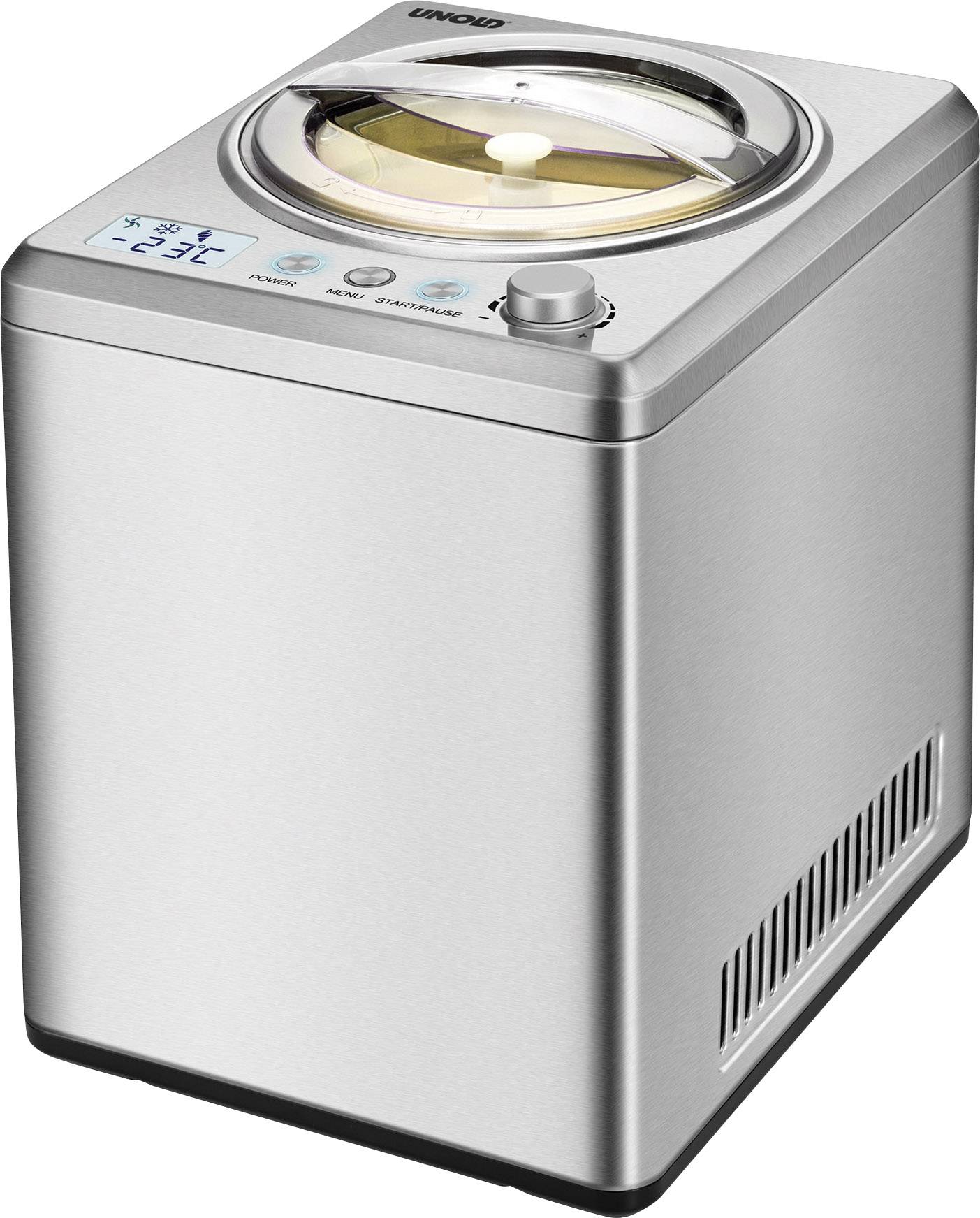 2,5 Liter Eiscreme – da kann nicht nur der Sommer kommen. Da kommen auch Gäste gern, um himmlisch-leckere Eiskreationen zu genießen. Denn mit der EISMASCHINE Profi Plus lässt sich ein guter Vorrat für die ganze Familie oder den Besuch vorbereiten. Auch „Nachschub“ ist kein Problem: Der robuste Motor ist für den Dauerbetrieb geeignet, der vollautomatische, selbstkühlender Kompressor sorgt für kontinuierliche Kälteerzeugung. Die Sahneeiscreme ist in nur ca. 45 Minuten (bei vorgekühlten Zutaten) fertig. Auch für veganes, laktosefreies oder steviahaltiges Eis ist die EISMASCHINE Profi Plus besonders gut geeignet. Typisch UNOLD® ist die moderne und praktische Ausstattung: Die EISMASCHINE Profi Plus hat ein elegantes und robustes Edelstahlgehäuse. Das große LCD-Display zeigt die Restlaufzeit an. Es gibt einen Digital-Timer, drei Programme mit Zeitwahl und einfach zu bedienende Tasten. Zur leichten Reinigung ist der Edelstahleisbehälter herausnehmbar.