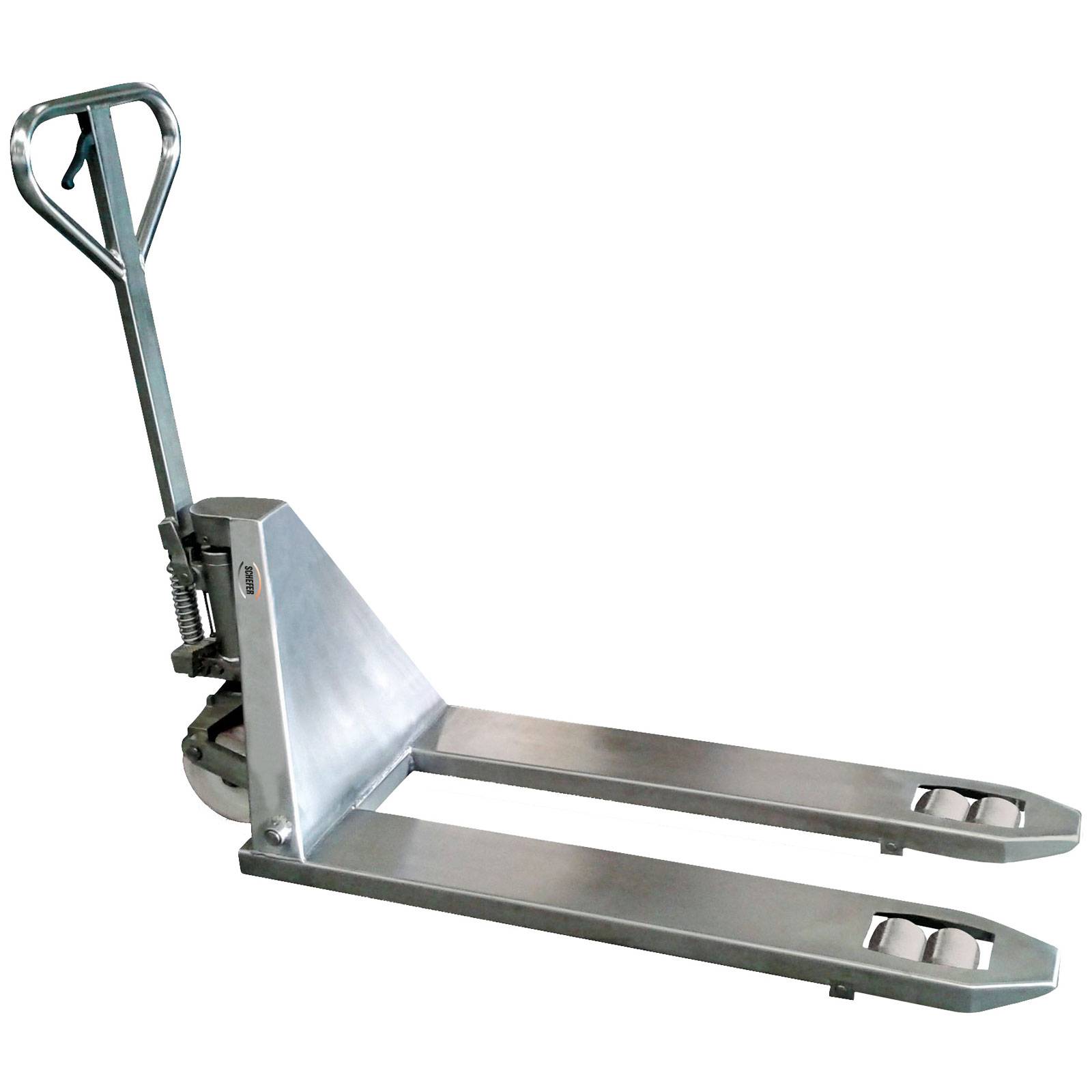 Im Bereich der Lebensmittelindustrie erfüllt der Edelstahl-Gabelhubwagen die Hygienevorschriften nach EN1672-1 und EN1672-2. Das spezielle Hydrauliköl NSF-H1 ist ebenfalls für den Lebensmittelbereich zertifiziert. Der nicht rostende Stahl W Nr. 1.4301, AISI 304 (V2A) ist gegen Wasser, Wasserdampf, Luftfeuchtigkeit, Speisesäuren sowie schwache organische und anorganische Säuren beständig.Die Tandemlastrollen und Lenkräder aus widerstandsfähigem Nylon bewegen Lasten bis 2000 kg zuverlässig und leichtgängig. Es wird empfohlen, den Gabelhubwagen nach jedem Einsatz mit klarem Wasser abzuspülen. Der Hubwagen sollte nicht für den Transport von Gitterboxen, Eisenpaletten oder ähnlichem verwendet werden. Der Edelstahl-Gabelhubwagen kann auf Anfrage auch mit 2000 mm Gabellänge geliefert werden.