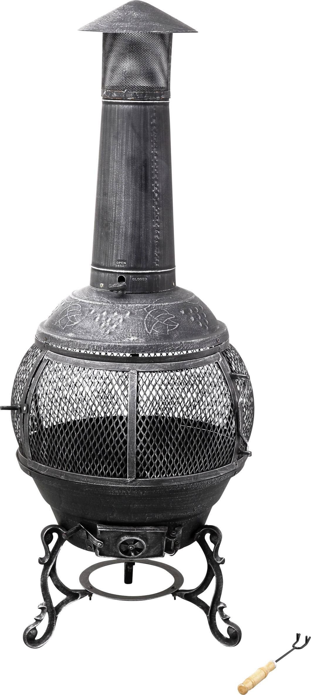 Gusseiserne Feuerwanne ca. 52 cm Ø · lackierter Feuerrost · große Öffnung zum Befüllen und Reinigen · hitzebeständige Lackierung · inklusive Schürhaken.