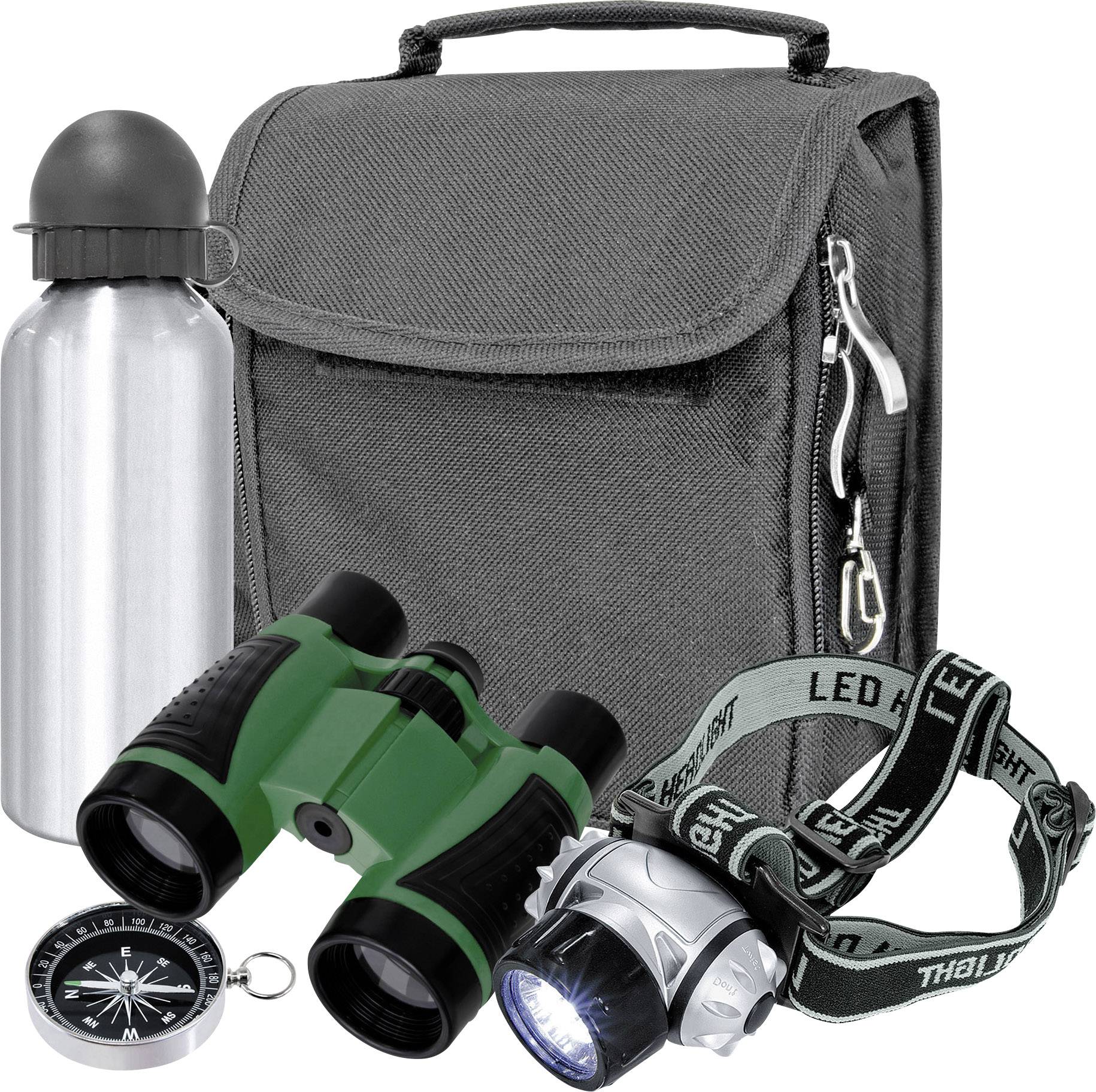 Draußen in der freien Natur auf Entdeckungstour gehen! Das wichtigste Equipment hierfür, ist in diesem Outdoor-Set enthalten. Eine Stirnlampe weist den Weg durch die Dämmerung und Dunkelheit. In einer Trinkflasche hat man immer genug Limo zur Stärkung dabei, mit dem Fernglas fällt die Ausschau nach spannenden Abenteuern umso leichter und dank des Kompasses kann man sich nicht verlaufen. Dank der praktischen Tasche mit Tragegriff, Gürtelschlaufe und Umhängegurt wird das Outdoorset ganz unkompliziert zum ständigen Begleiter auf allen Erkundungstouren.