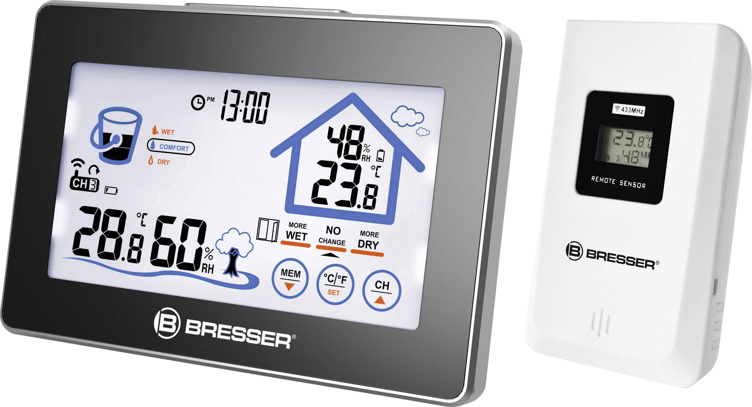 Der BRESSER Funk-Hygrometer bietet eine innovative Raum-Lüftungsempfehlung. Mit Touchscreen kann die Station sehr schnell bedient und eingestellt werden. Neben der Lüftungsempfehlung werden Uhrzeit, Innen- und Außentemperatur sowie Innen- und Außenluftfeuchtigkeit angezeigt. Für zusätzlichen Komfort ist die Station mit einer weißen Hintergrundbeleuchtung ausgestattet die durch die Lichttaste im oberen Rahmen ausgelöst wird.