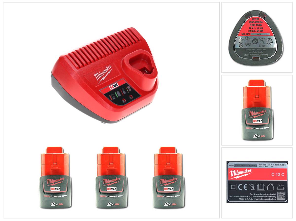 - 3x Milwaukee M12 B 12 V - 2,0 Ah Li-Ion Akku