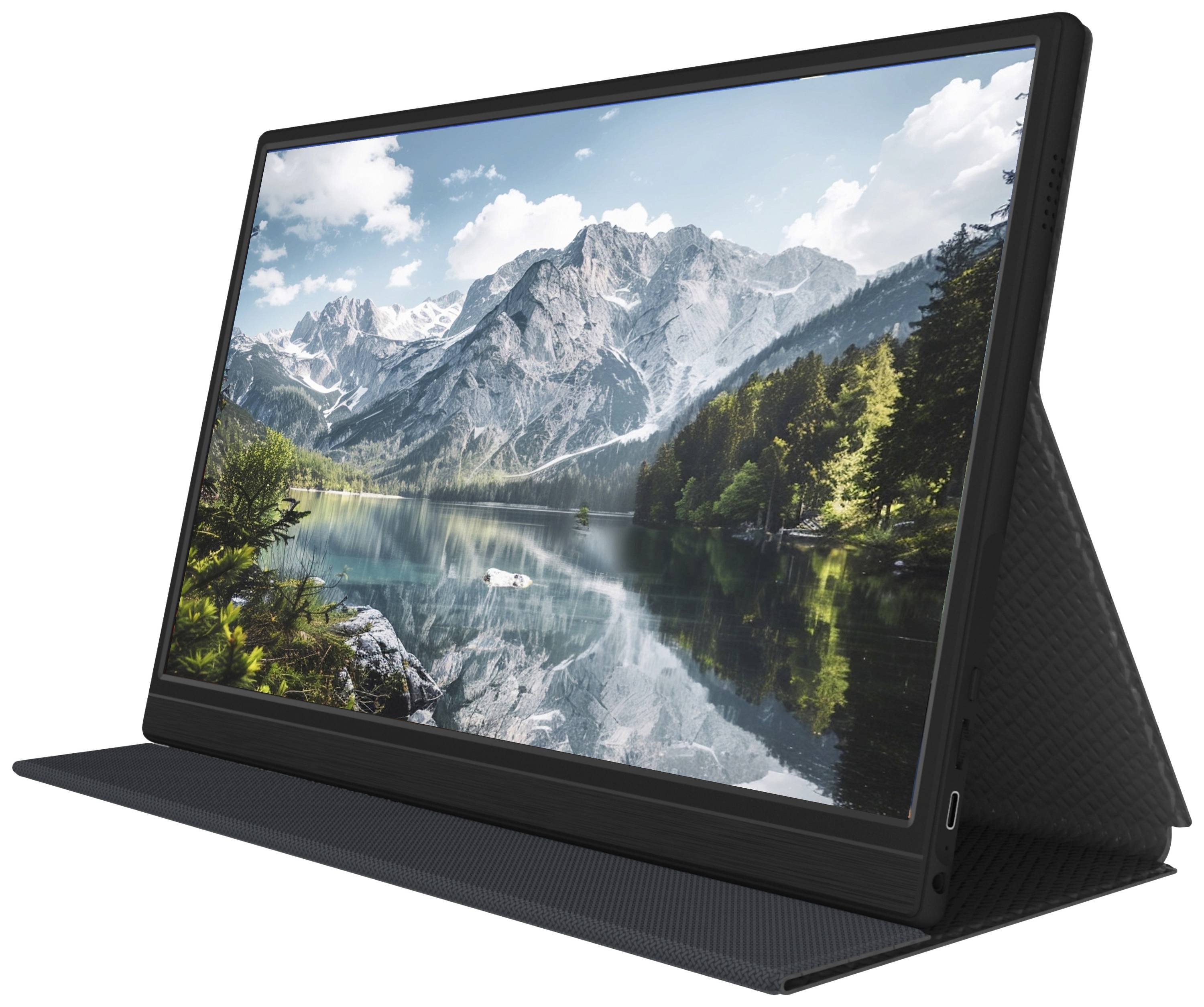 Tragbarer 15,6-Zoll-FULL-HD-Monitor mit schwarzer Abdeckung, die auch als magnetischer Ständer dient.