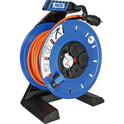 Kunststoff mit glasfaserverstärktem Trommelfuá, stehend und liegend einsetzbar, Rotationsstopp-Schalter, mit abnehmbarer Kabelfhrung und ergonomischem Tragegriff fr mehr Tragekomfort, Thermoschalter, 4x Schutzkontaktsteckdosen mit Klappdeckel und Gummistecker, groáer klappbarer Drehgriff fr eine Individuelle Rechts- und Linkshandbedienung, Trommelk”rper mit einer Schräglage von ca. 7ø Grad fr eine verbesserte Sicht auf den Steckdoseneinsatz, fr mehr Bodenfreiheit und zum optimalen Abflieáen von Nässe, Wandmontage durch rckseitige Bohrungen m”glich, Hammerschlagzeichen T, entspricht DGUV 203-006 (bisher BGI 608), IP44, VDE, zum ständigen Einsatz im Freien zugelassen