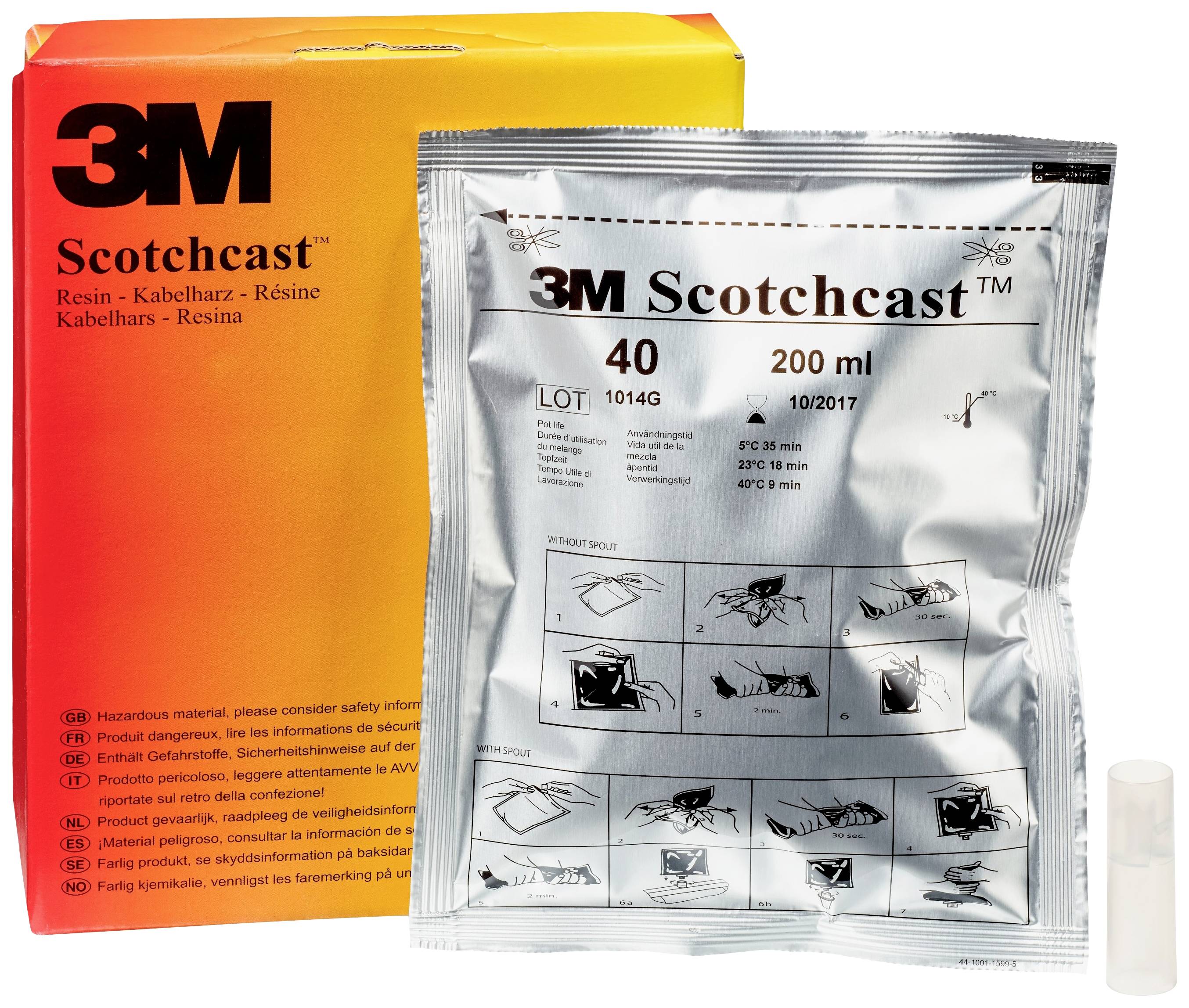 3M™ Scotchcast™ Gießharz 40 eignet sich als elektrische Isolierung und mechanischem Schutz von elektrischen Verbindungen für den Einsatz bis 1 kV. Das wasserabweisende Polyurethanharz erfüllt die Anforderungen gemäß CENELEC HD631.1 S2 und ist mit der EU-Richtlinie 2011/65/EC (RoHS) sowie mit der EU-Richtlinie 1907/2007/EG (REACH) konform. Es gewährleistet den höchsten Grad an elektrischer Isolierung für die professionelle Anwendung. Schnelle und saubere Anwendung dank dem neuen 3M patentierten integriertem Vergussstutzen im Harzbeutel. Beutelöffner wird mitgeliefert.