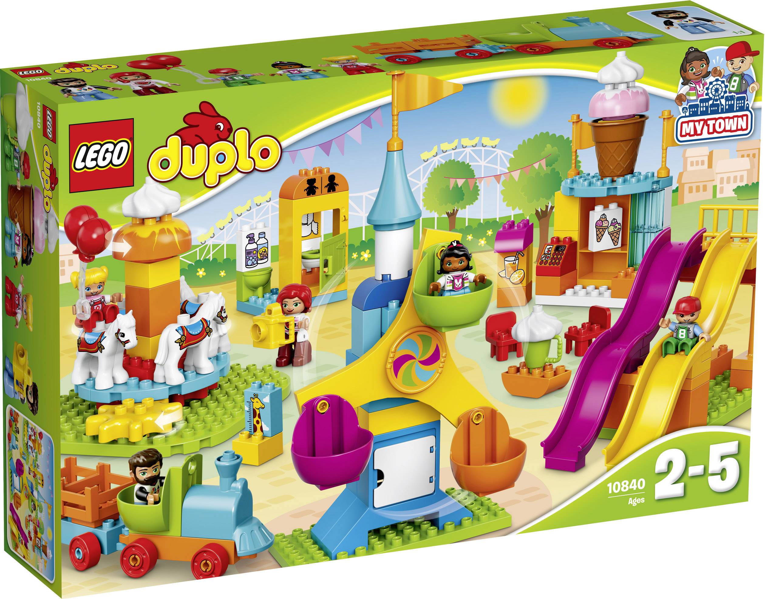 · Enthält fünf LEGO® DUPLO® Figuren: zwei Erwachsene und drei Kinder · Enthält ein Riesenrad mit drei Gondeln und Drehfunktion, ein kreisendes Karussell mit vier Pferdefiguren und Zahnradfunktion, zwei Wellenrutschen, einen Zug mit Waggon, einen Eisstand mit Tisch und Stühlen sowie eine Toilettenhäuschen mit WC und Waschbecken · Enthält Steine, die als Eis, Orangensaft, Messtabelle, Toilettenpapier und Seifenflaschen verziert sind · Das Zubehör umfasst eine Kamera, Luftballons, Schlagsahneund eine Tasse · Helfen Sie Ihrem Kind beim Bedienen der Drehfunktionen, um das Riesenrad und das Karussell kreisen zu lassen · Kleinkinder werden die LEGO® DUPLO® Figuren mit großer Begeisterung die Wellenrutsche hinuntersausen lassen oder im Zug herumschieben · Benutzen Sie die modernen Figuren, Zubehörelemente und verzierten Steine, um lustige Familienabenteuer in einer aufregenden Jahrmarktkulisse nachzuspielen· LEGO® DUPLO® Produkte sind speziell für kleine Hände geeignet und beso nders sicher aufgemacht · Dieses Set bietet Kindern im Alter von 2 bis 5 Jahren ein altersgerechtes Bau- und Spielerlebnis · Das Riesenrad ist 38 cm hoch, 19 cm breit und 16 cm tief · Das Karussell ist 20 cm hoch, 21 cm breit und 19 cm tief · Der Eisstand ist 24 cm hoch, 12 cm breit und 7 cm tief · Der Zug ist 9 cm hoch, 24 cm lang und 6 cm breit · Lässt sich mit dem Set 10839 Wurfbude kombinieren, um das Jahrmarktgelände noch zu erweitern · Die Modellreihe Meine Stadt umfasst mehrere Produkte, die Kinder sammeln können, um damit Familienspaß in einer erkennbaren LEGO® DUPLO® Welt zu erleben.