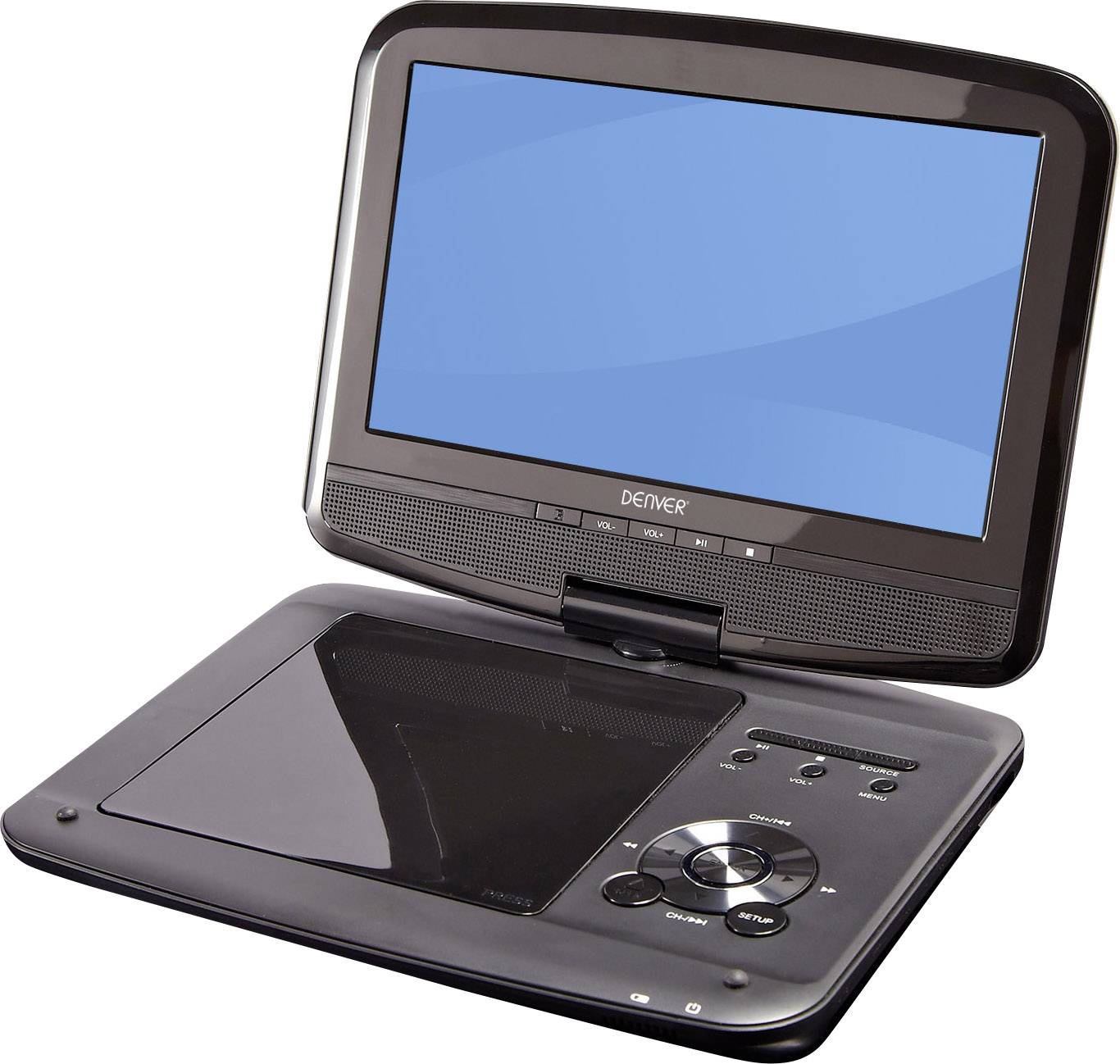 Der tragbare DVD Player von DENVER verfügt über ein dreh-/schwenkbares TFT/LCD Display und eingebaute stereo Lautsprecher