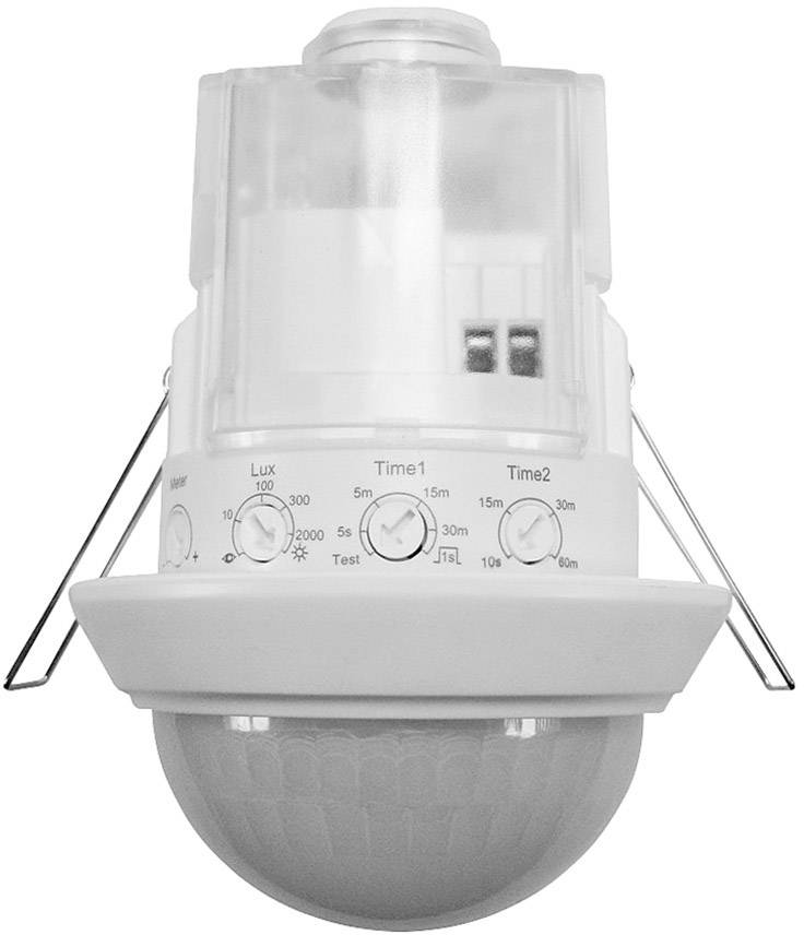 Sensor und Anschluss in einer Einheit. Das Gehäuse hat Springklammern zur Befestigung in Decken. Zwei Relais kontrollieren Licht und Heizung/Lüftung Eingebauter Geh-Test um den Erkennungsbereich einzustellen eine rote LED zeigt die Erkennung an. Die Umgebungsbeleuchtung kann für eine flexible Anwendung eingestellt werden.