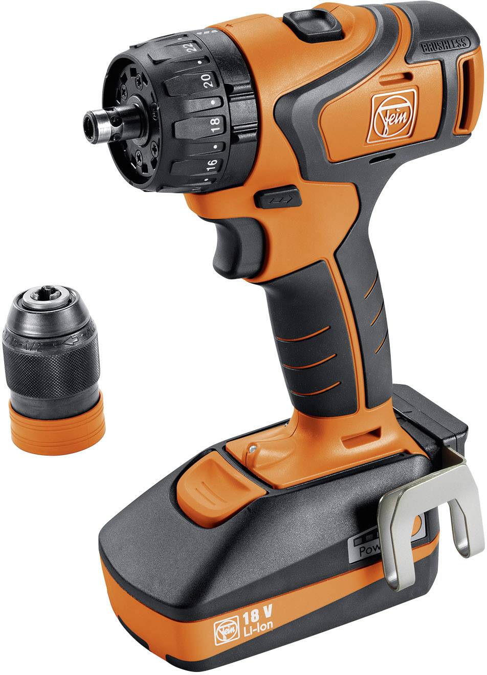 Rechts-/Linkslauf · Lithium-Ionen Technologie · 2-Gang Vollmetall-Getriebe · MultiVolt-Schnittstelle (12 - 18 V Akkus kompatibel) · Bürstenloser FEIN PowerDrive Motor · QuickIN Zubehörschnittstelle · 22-stufige Drehmomentvorwahl plus Bohrstufe · SafetyCell Technology · Ladezustandsanzeige · Integriertes LED-Arbeitslicht.