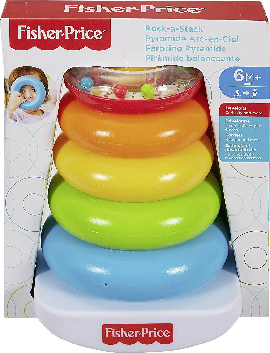 Beim Stapeln wird das Baby spielerisch mit Größenverhältnissen und Farben vertraut gemacht und trainiert dabei seine Koordination. Fünf stabile Plastikringe reihen sich auf der Schaukelbasis auf. Im obersten Ring verstecken sich drei kleine Perlen, die unter der durchsichtigen und bunt glitzernden Oberfläche lustig herumrollen. Die Pyramide lässt sich auf der Schaukelbasis hin- und herschaukeln.