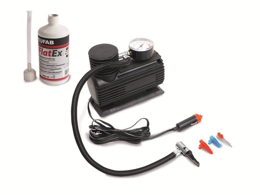 Pannenset bestehend aus einem Mini-Kompressor und einer Flasche mit Reifendichtmittel. Das beschädigte Rad muss nicht abgenommen werden. Der Inhalt der Flasche ist ausreichend für einen gängigen Autoreifen. Lieferung in praktischer Aufbewahrungstasche. Features: - Für den mobilen Einsatz bei der Pannenhilfe - Betriebsspannung Kompressor: 12 V- - Druckleistung: 17 bar - Inhalt Reifendichtmittel "FlatEx": 450 ml