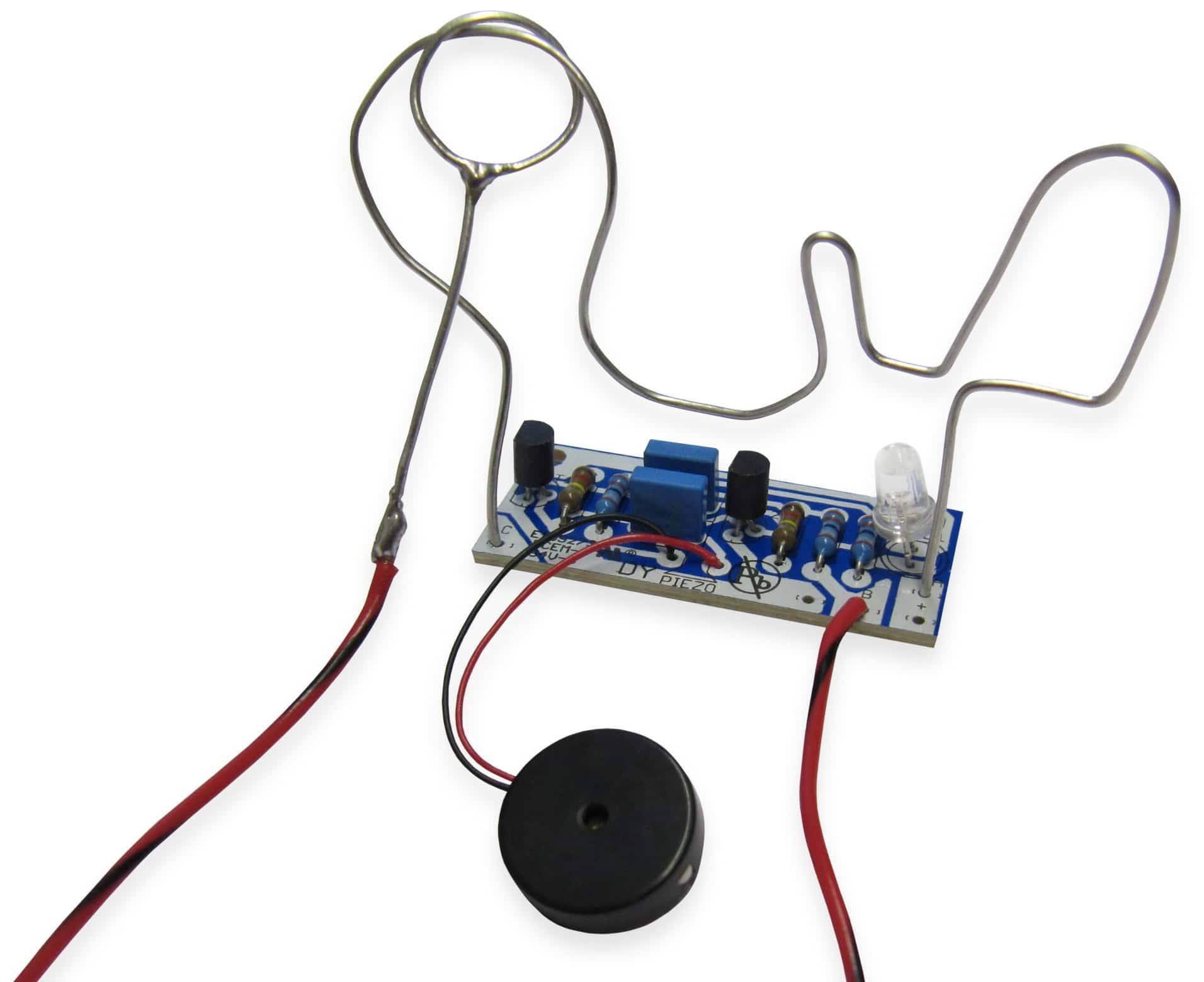 Es kommt darauf an, eine kleine Drahtschlaufe durch einen, in viele Bögen und Hindernisse gebogenen Draht zu fädeln. Wer mit der Drahtschlaufe den Fädeldraht berührt, löst ein akustisches und optisches Signal aus. Ein interessantes Spiel für Partys und lange Abende. Passendes Gehäuse G027N Technische Daten: - Betriebsspannung: 9 - 12 V/DC - Fehleranzeige: optisch + akustisch - Platinengröße: ca. 45 x 20 mm Schwierigkeitsgrad FORTGESCHRITTENE Altersempfehlung ab 14 Jahren (Nur unter Aufsicht eines Erwachsenen)